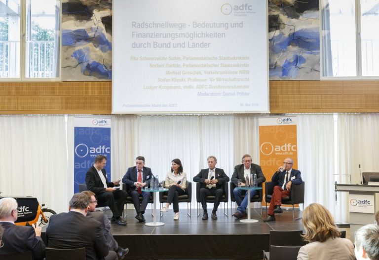 Verkehrspolitiker aus Bund und Ländern waren sich beim Parlamentarischen Abend des ADFC einig, dass Radschnellwege enormes Potenzial haben, Autofahrer auf das Rad zu bringen und damit Stau- und Klimaprobleme von Ballungsgebieten in den Griff zu bekommen. Pläne gäbe es überall in Deutschland – nur bei der Finanzierung klafften riesige Lücken. Der Bund ziehe sich bei der Finanzierungsfrage bisher auf Nicht-Zuständigkeit zurück. Doch im Laufe der teils hitzig geführten Podiumsdebatte keimte Hoffnung auf.