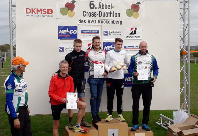 Für den Ausrichter, den RVG Rockenberg, war die sechste Auflage des inzwischen etablierten Äbbel-Cross-Duathlon eine große Herausforderung. Der Start/Ziel-Bereich mit Wechselzone auf dem Sportgelände in Rockenberg war wieder in enger Kooperation mit dem TUS Rockenberg vorbildlich präpariert. Die sonst sehr schnelle und gut befahrbare 14,3 km lange Radstrecke über Feldwege und den Wohnbacher Forst, erforderte durch die Regenfälle der vergangenen Tage noch mehr Aufmerksamkeit. ,,Besonders erfreulich ist, dass es keine nennenswerten Stürze gab. Dennoch erreichten nicht alle das Ziel, denn auch die Defekte hatten sich gehäuft“, äußerste sich Jan Traub als RVG Fachwart und Organisator über die Veranstaltung. Wie in den Jahren zuvor wurden vor Ort auch wieder Typisierungen für die DKMS (Deutsche Knochenmark Spenderdatei) durchgeführt und eine Tombola mit lukrativen Preisen zugunsten der DKMS organisiert. Der Wert der Sachpreise überstieg den Preis für die Lose deutlich und vom Loskauf wurde reger Gebrauch gemacht. Um dem Namen Äbbel-Cross gerecht zu werden gab es für alle Teilnehmenden ein Stück Apfelkuchen und für die Sieger neben Ruhm und Stolz eine Flasche Apfel Secco.