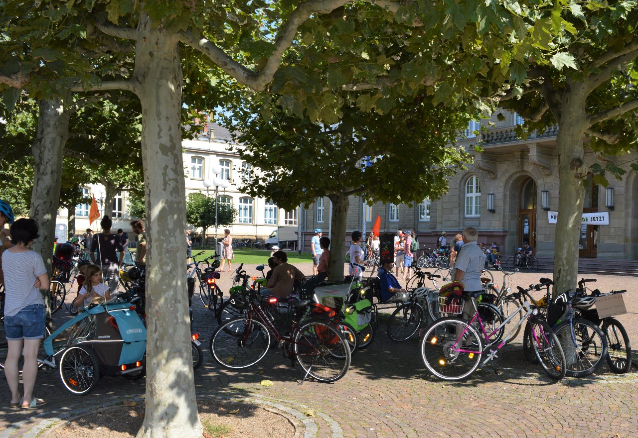 Rund Einhundert junge und auch ältere Radler kamen zusammen, um trotz schönstem Badewetter und parallel stattfindender Veranstaltungen für Familien, auf ihre Anliegen aufmerksam zu machen. Am Uni-Hauptgebäude eröffnete Anette Wasseroth die Kundgebung mit dem Verweis auf fehlende Zebrastreifen in der Stadt, zum Beispiel am Waldkindergarten Rocky Hill und an der Liebigschule, wo auch für die über 1.000 Schüler keine Radwege zu finden sind.