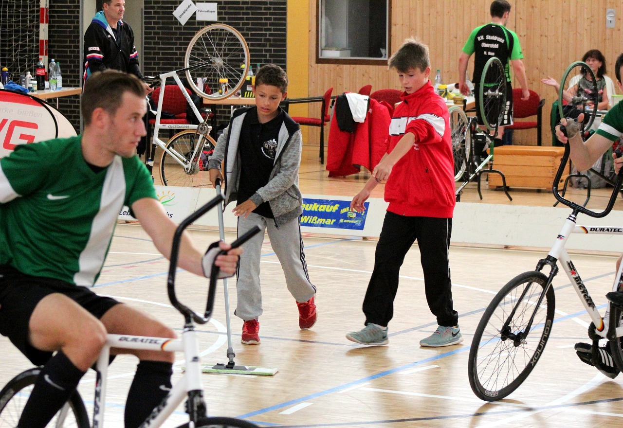 Ein ungewöhnlich begehrter Platz beim Weltcup-Spieltag war der Platz am Schrubber. Die Nachwuchsradballer des Ausrichters waren im Einsatz um in den Halbzeitpausen die Spielfläche von Schweiß ihrer Vorbilder und den Spuren ihrer Duelle zu reinigen. Und während Einer wischte standen schon vier andere Schlange um auch einmal den Schrubber schwingen zu dürfen. So hatten selbst die Jüngste eine Aufgabe im Team des Vereins und einen aufregenden Tag.