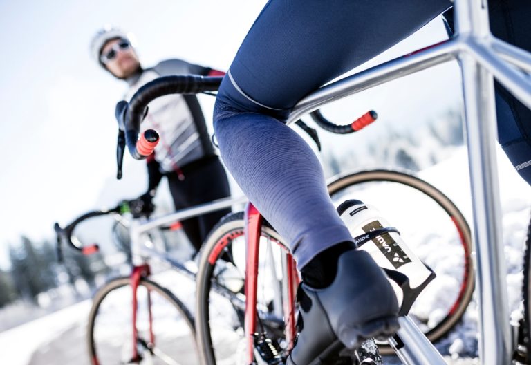 Ohne warme Kleidung steigt man im Winter nicht aufs Rad. Erfahrene Radfahrer wissen jedoch, dass man bei zu warmer Kleidung gerade bei längeren oder hügeligen Strecken schnell ins Schwitzen kommt, was wiederum für schnellere Unterkühlung sorgt. Deshalb ist eine optimierte Bekleidungswahl wichtig, doch die bekommt man erst mit ein bisschen Erfahrung. Als Ergebnis steht das sogenannte Zwiebelprinzip bestehend aus Funktionsunterwäsche (z. B. „Base LS Shirt“ von Vaude, 85 Euro), einer Isolationsschicht (z. B. „Kabru Light Jacket III“, Vaude, 220 Euro) und zum Abschluss einem Wetterschutz (z. B. „Cyclist Jacket II“, von Vaude, 160 Euro). So ist man für unterschiedliche Wetterbedingungen gerüstet.