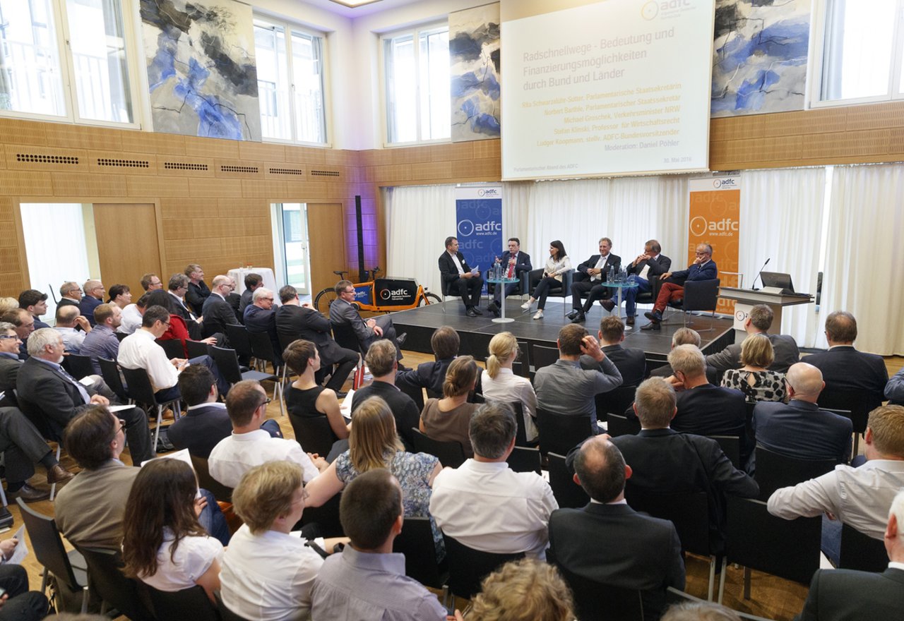 Verkehrspolitiker aus Bund und Ländern waren sich beim Parlamentarischen Abend des ADFC einig, dass Radschnellwege enormes Potenzial haben, Autofahrer auf das Rad zu bringen und damit Stau- und Klimaprobleme von Ballungsgebieten in den Griff zu bekommen. Pläne gäbe es überall in Deutschland – nur bei der Finanzierung klafften riesige Lücken. Der Bund ziehe sich bei der Finanzierungsfrage bisher auf Nicht-Zuständigkeit zurück. Doch im Laufe der teils hitzig geführten Podiumsdebatte keimte Hoffnung auf.