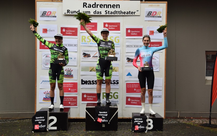 Eingerahmt von den zwei Rennen der Kriteriumsmeisterschaft fuhren die Frauen und Juniorinnen erstmal bei einem Kriterium einen Lauf der „Müller – Die lila Logistik Rad-Bundesliga“ aus, dessen Tagessieg sich Helena Bieber von den RSG Gießen BIEHLER vor Teamkollegin Katharina Fox und Finja Smekal (Drops Le Col) in ungeplanter Weise sicherte: Sie war scheinbar sehr mutig direkt nach dem Start des Rennens über 50 Runden (= 40km) ausgerissen und überrundete nach der Hälfte des Rennens ihre Verfolgerinnen in eindrucksvoller Manier. „Geplant war es nicht, von Anfang an direkt loszulegen. Meine Teamkollegen Lydia Ventker hat mir dann gesagt, dass hinter mir ein Loch ist, weil ich vielleicht so schnell durch die Kurven gefahren bin. Dann bin ich einfach losgefahren. Dass das geklappt hat, war dann schon sehr gut“, freute sich Bieber, die damit das Trikot der Gesamtführenden noch etwas fester auf ihren Schultern sitzen hat. Zudem konnte sie sich auch noch das Trikot der besten Sprinterin des Tages überstreifen, denn die Wertungsrunden gingen als Sprintpunkte in die Bundesliga-Wertung ein. Ricarda Bauernfeind von der RSG Ansbach verteidigte das Trikot in der Nachwuchswertung und die RSG Gießen BIEHLER konnten sich als Siegerinnen in der Teamwertung ebenfalls über die mannschaftliche Zusammenarbeit an diesem aufreibenden Renntag freuen.