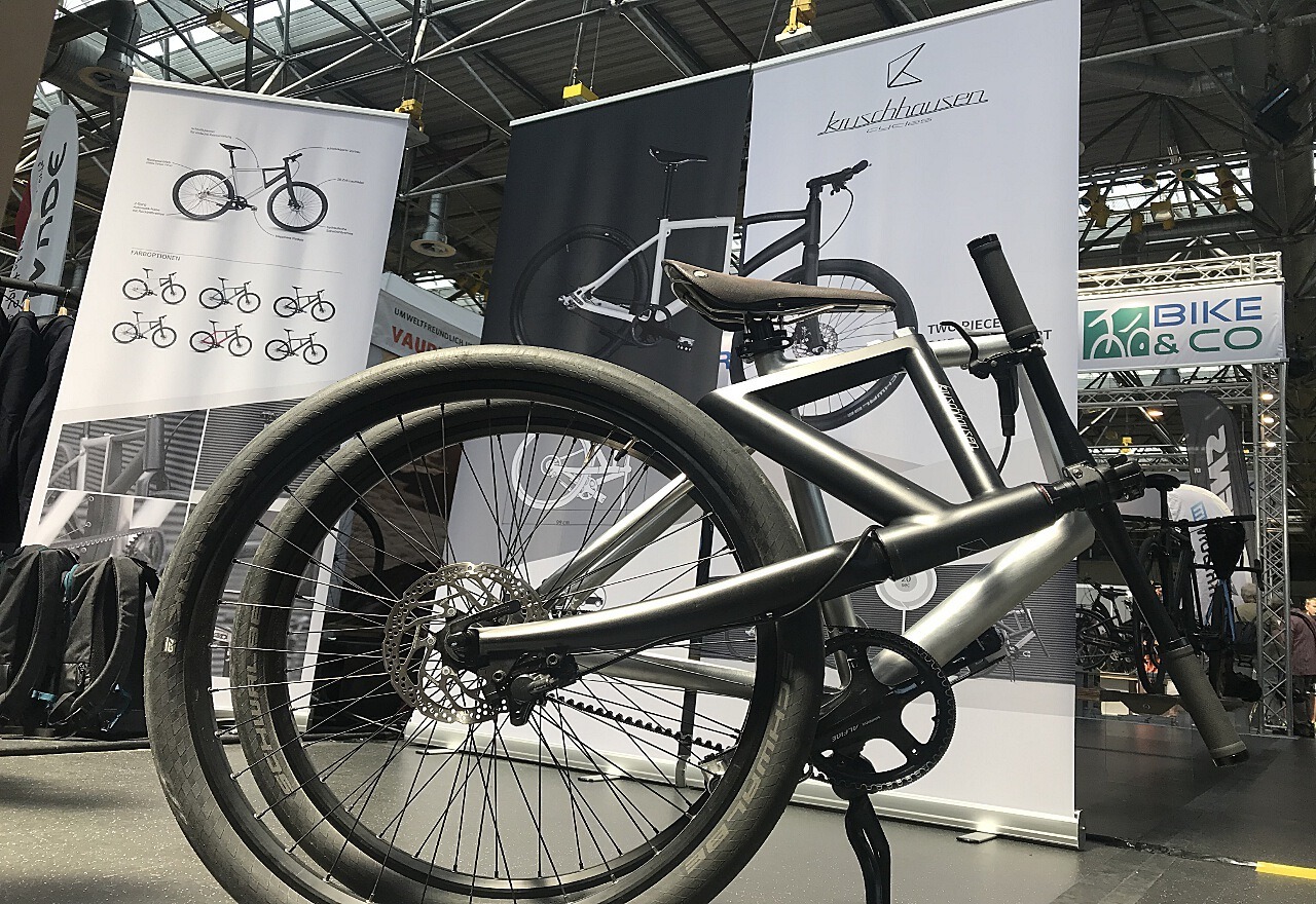 Bei Kruschhausen Cycles sehen wir zunächst ein stilvolles Urbanbike mit Riemenantrieb: das Fiiz. Die vordere Rahmenhälfte ist schwarz-matt lackiert, die hintere in einem gebürsteten Aluminium angelegt. Das Highlight hingegen ist nicht die Optik, sondern die Funktionalität. In wenigen Handgriffen zerlegt man das Fiiz in zwei Hälften, die man dann mittels Stecksystem zu einer kompakten Einheit verbindet – ohne Werkzeug. Trotz der 26 Zoll großen Räder entsteht ein Transportformat, das im Kofferraum eines Stadtflitzers oder der Gepäckablage eines ICE verstaut werden kann. Da die beiden Laufräder nebeneinander angeordnet sind, lässt sich das Fiiz bequem am Griff des Lenkers schieben, ziehen und sogar bremsen. Wir sagen: einfach genial. Der Cyclingworld Düsseldorf Award sagt: BEST URBAN-BIKE 2018. Das Fiiz ist eine Innovation, die als Crowdfunding-Kampagne auf der Plattform Startnext angemeldet wurde. Für die Produktion der ersten Serie braucht das Stuttgarter Unternehmen finanzielle Unterstützung von Interessierten und Käufern.