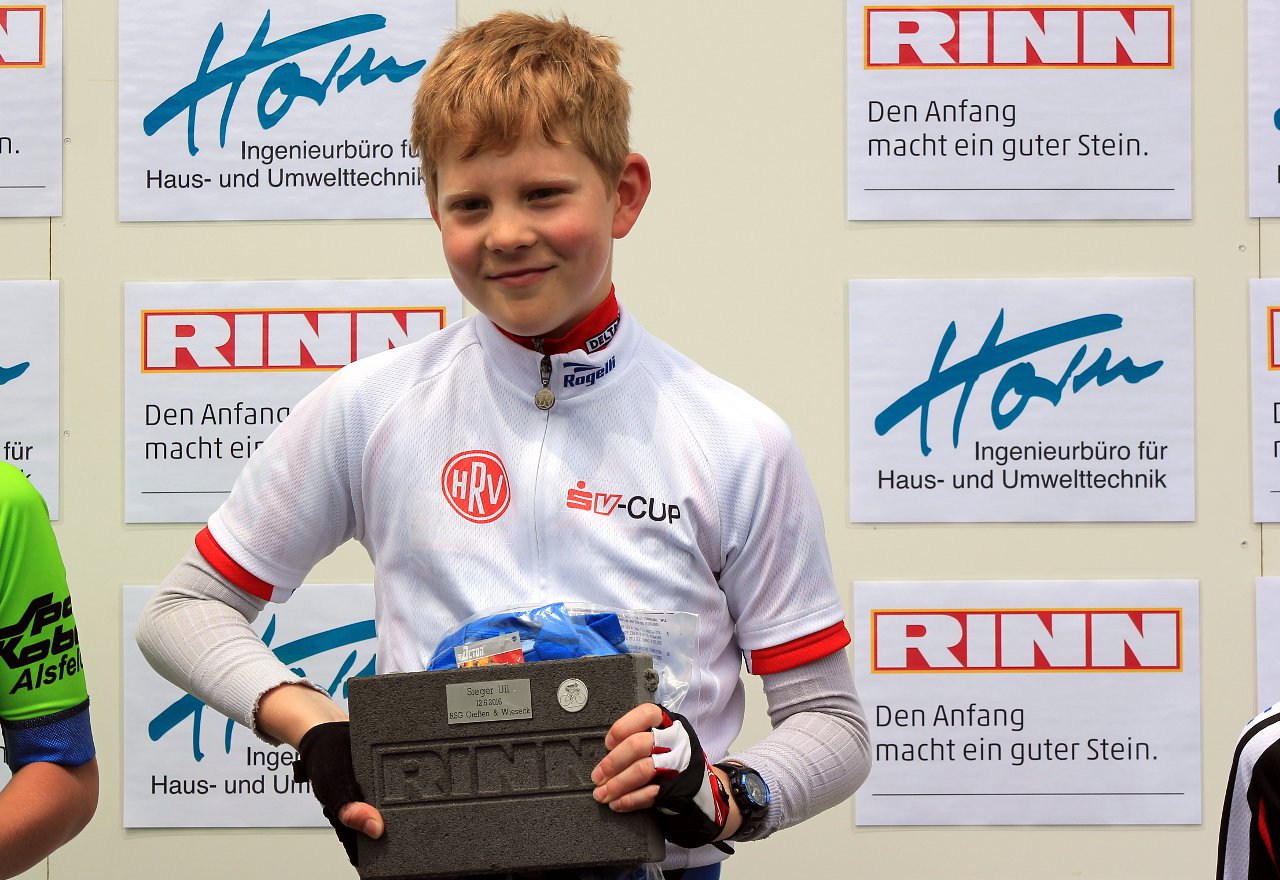 Auf den Plätzen acht, elf und 13 wurden im Fördercup-Rennen der Schüler U13 Arvid Koop 8RV Gießen-Kleinlinden), Jaouen Viau (RSG Gießen und Wieseck) und Lukas Krämer (RSG Buchenau) mit Bezirksmeisterschaftsmedaillen ausgezeichnet. Bezirksmeister und zugleich auch Tagessieger der Schüler U11 wurde Tim Nissel. Der Nachwuchsfahrer der RV Gießen-Kleinlinden war im Führungstrikot des SV Sparkassenversicherung Fördercups gestartet und stand dementsprechend stark unter Beobachtung seiner Gegner. Als amtierender Hessenmeister im Straßenrennen setzte sich Nissel souverän durch, so dass gemeinsam mit der Trophäe von Vater Martin Nissel Steine schleppen angesagt war, denn für die Podiumsplatzierung waren originelle Pokale aus Steinen des Rinn Ideengartens kreiert worden – mit dem entsprechenden Gewicht. „Normalerweise sind die noch dicker, aber für das Rennen haben wir zwei Drittel abschneiden lassen“, war aus dem Helferteam der RSG Gießen und Wieseck zu erfahren.