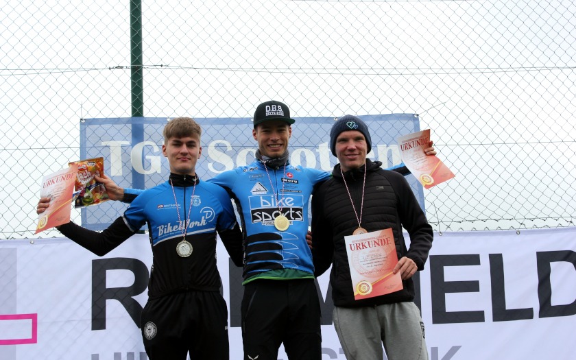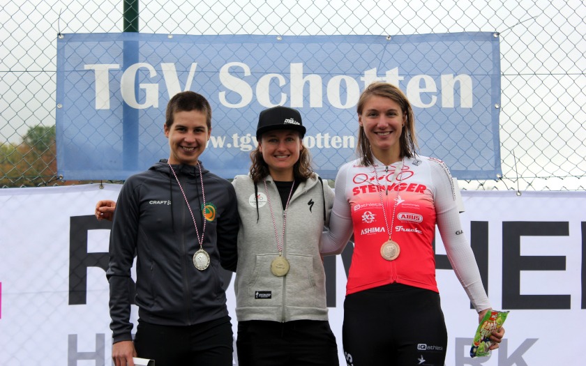 Vanessa Schmidt unterwegs aus der Ferne zu erkennen, erforderte genaues Hinsehen, denn der schlammige Untergrund hüllte mit der Zeit alle Trikots in einheitliches Schwarz, die Schmidts Outfit dann sehr ähnlich waren. Doch schon nach der ersten Runde war klar, wo man Vanessa Schmidt im Feld der Teilnehmenden finden sollte und nach zwei Runden wurde dieser Platz dann in der Ergebnisliste festgeschrieben: Die Mittelhessin aus Wolzhausen in der Gemeinde Breidenbach wurde auf Platz 15 im Gesamtergebnis der Mittelstrecke neue Hessenmeisterin im Mountainbike Marathon vor Friderike Schnatz (Radwerk Upland) und Stephanie Frank (MTBC Wehrheim / Stenger-Bike Team). Schmidt strahlte mit der inzwischen durch die Wolken kommenden Sonne und freute sich über ihre Hessenmeisterschaft, die zugleich ihre letzte war, denn zum Jahresende ist ein Umzug nach Rheinland-Pfalz geplant. Das wäre noch kein Grund, nicht mehr bei Hessenmeisterschaften startberechtigt zu sein, denn dafür ist bei Amateuren der Sitz des Vereins maßgeblich, mit dessen Rennlizenz man fährt. Es sei aber zugleich ihr letztes Rennen im schwarzen Rennoutfit gewesen, verriet Schmidt und kündigte damit Neuigkeiten für die Wochen zwischen der jetzt beendeten und der neuen Saison an.