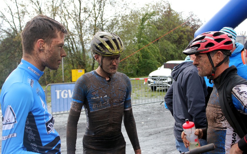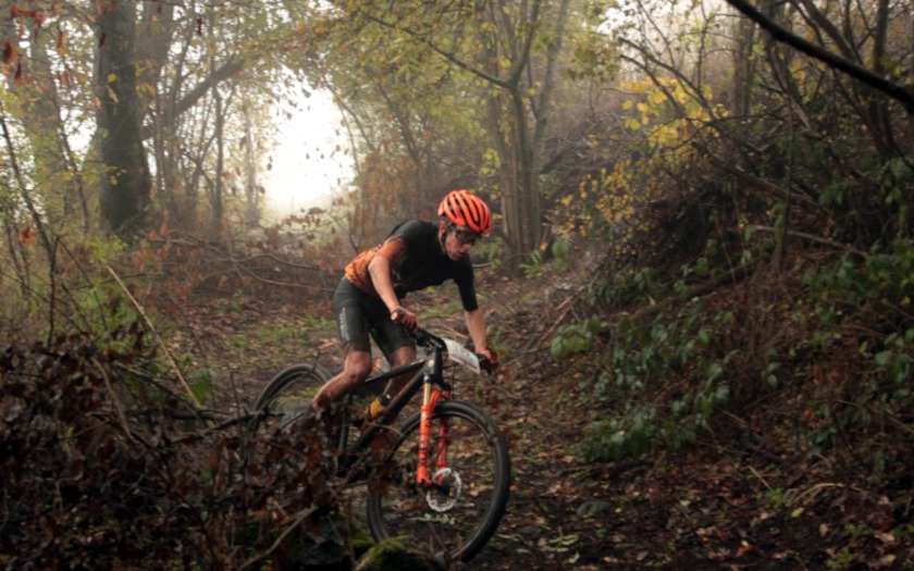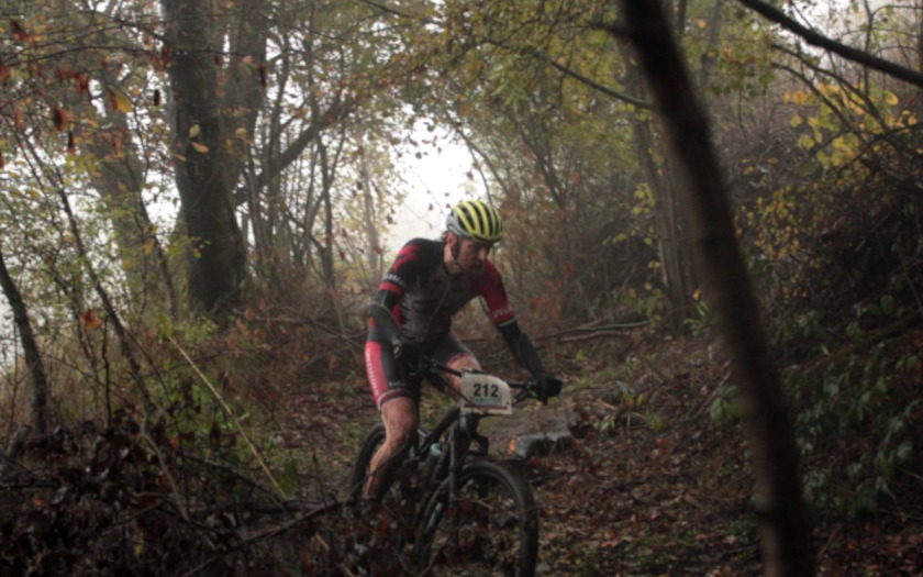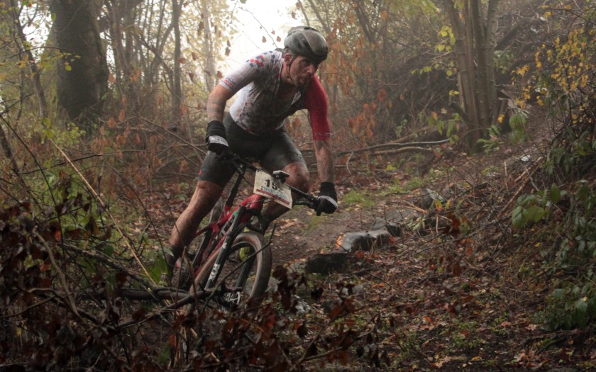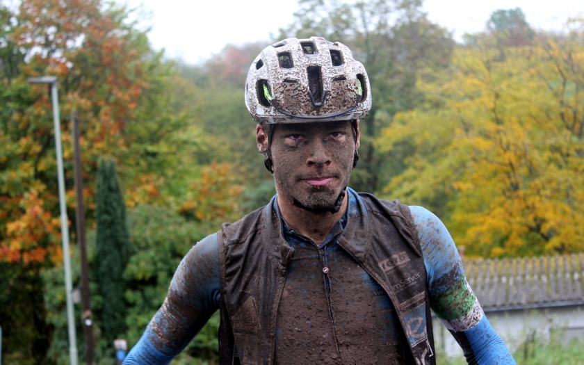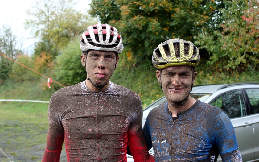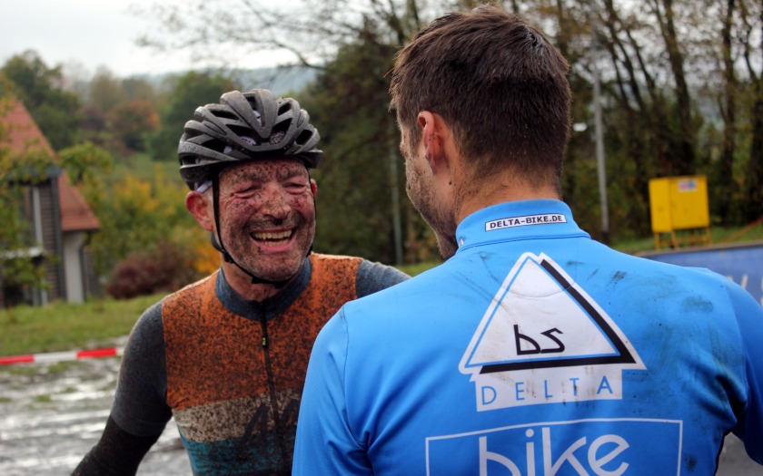 Am ersten Anstieg der zweiten Runde mussten Adler und Libesch abreißen lassen. Jung, Wilhelmi, der Drittplatzierte am Dünsberg, und Zimmer waren fortan das Spitzentrio. In einem sehr schlammigen Abschnitt setzte Noah Jung eine Attacke und gewann an Vorsprung. Dass seine Verfolger sofort außer Sichtweite gerieten, lag aber vor allem am dichten Nebel rund um den Hoherodskopf. Dadurch dürfte es auch in der letzten Runde nochmal schwerer gewesen sein, den Vorsprung mit der richtigen Kraftdosierung in sicherer Größe zu halten. Und Jungs am Start noch strahlend blaues DELTA-BIKE.DE-Trikot wurde mit jeder Runde schlammiger, so dass später alle Teilnehmenden in einheitlichem Schwarz unterwegs waren und sich Gegner der Altersklassen kaum noch erkennen konnten.