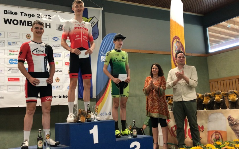 Für eine Überraschung sorgte der Zieleinlauf der 30km-Strecke in diesem Jahr: Mit Sieger Mika Schöpplein (SKG Bauschheim/Stenger-Bike-Team) und dem Drittplatzierten Henrik Braun (TGV Schotten/Team HWG Gedern) standen nach 1:15 Stunde bzw. 1:18 Stunde zwei Juniorenfahrer auf dem Treppchen der Tageswertung auf dieser Distanz. „Wir waren die ersten 30 Minuten noch alle zusammen – zu dritt, zu viert vorne. Irgendwann konnte ich das Tempo vorne nicht mehr ganz mitgehen, dann waren wir in einer Zweier-Gruppe um Platz drei und vier“, schilderte Henrik Braun die Ereignisse auf der Strecke. Fünf Kilometer vor dem Ziel konnte er dann eine Attacke fahren: „Die saß dann auch ganz gut und ich konnte den Abstand halten, bis ins Ziel“, schilderte der Unter-Schmittener das Rennen, das bei hochsommerlichen Temperaturen durch den großen Flüssigkeitsbedarf erschwert wurde. Zwischen Schöpplein und Braun fand Hannes Spahn (WILIER/FORCE Germany) als bester der Herren-Klasse seinen Platz auf dem Podium.