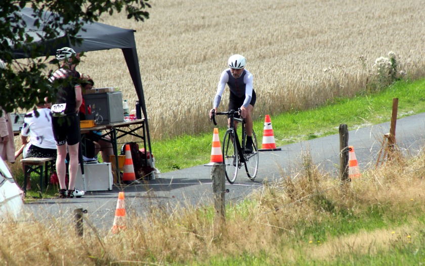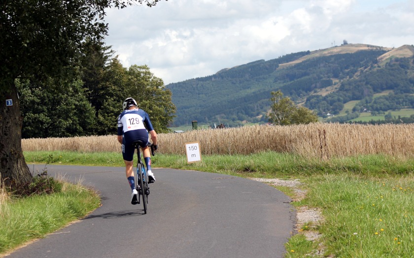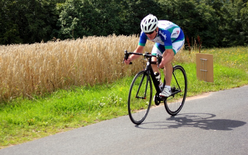 Dass das Rennen sehr fordernd werden würde, ahnte auch Christian Schmidt von der RSG Gießen und Wieseck, der für das Team pro-juventute.org fährt, vor seinem Start in der Masters-Klasse III. Die letzten Meter seines Kampfes gegen die Uhr und die Höhenmeter der Rhön absolvierte er nach zahlreichen Aufs und Abs mit groß aufgelegtem Gang, was seine Fahrweise von der seiner Gegner deutlich unterschied. Doch Christian Schmidt hatte sich die Strecke offensichtlich gut eingeteilt, die jeweils richtige Übersetzung aufgelegt und gute Beine, denn nach Platz drei im Straßenrennen im Mai und Platz zwei im Einzelzeitfahren im Juli machte er jetzt mit Platz eins im Bergzeitfahren seine Medaillensammlung der diesjährigen Hessenmeisterschaften komplett. 1,47 Sekunden mehr brauchte Dirk Strothmann (15:50,16 Minuten, RSV Gütersloh) und 12,40 Sekunden Rückstand ließen Volker Brockhagen (16:01,09, RSC Göttingen) als Dritten auf dem Treppchen des zweiten Rennens im Hessen Berg-Cup stehen. Auf dem Podium der Hessenmeisterschaft war Schmidt eingerahmt von Dirk Keßler (17:03,54, RVG Rockenberg) und Dirk Rademacher (17:29,89, Cycling Team Rhein-Main Rödermark). Schmidts neuer Vereinskollege Gerhard Schöpke kam in 19:00,99 Minuten als Gesamt-Siebter auf Platz vier der Hessenmeisterschaft, vor Mario Lembke (20:23,77, RVG Rockenberg) als Achter und Hessen-Fünfter. Mit 16:10,11 Minuten über die 5,96 Kilometer und 20,76 Sekunden Polster auf Heiko Katzler (16:30,87, RSV Bad Hersfeld) wurde Thorsten Dresing vom RSV Marburg neuer Hessenmeister der Masters II.