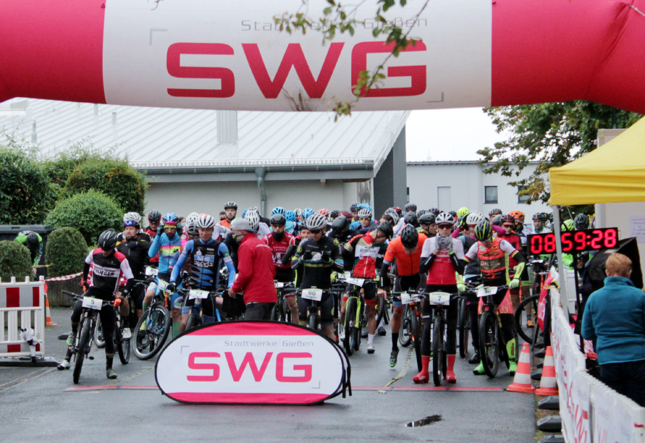 Noch wenige Sekunden bis der 14. Dünsberg-Bike-Marathon startet: Um 9 Uhr wurde mit den Fahrern der Langstrecke die erste Rennklasse losgelassen - das freute auch den ausrichtenden AMC Rodheim-Bieber im Jahr der Corona-Pandemie ganz besonders. Foto: Stephan Dietel