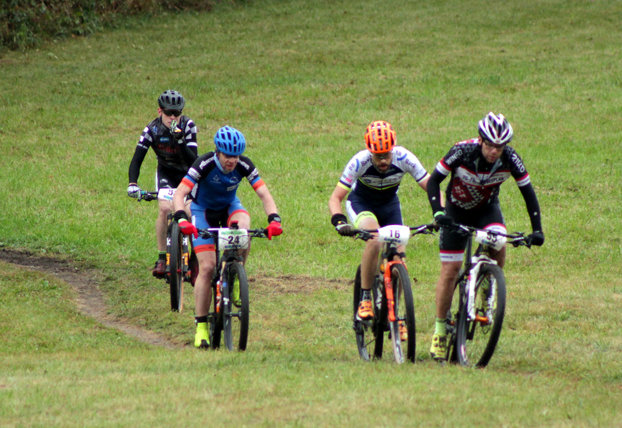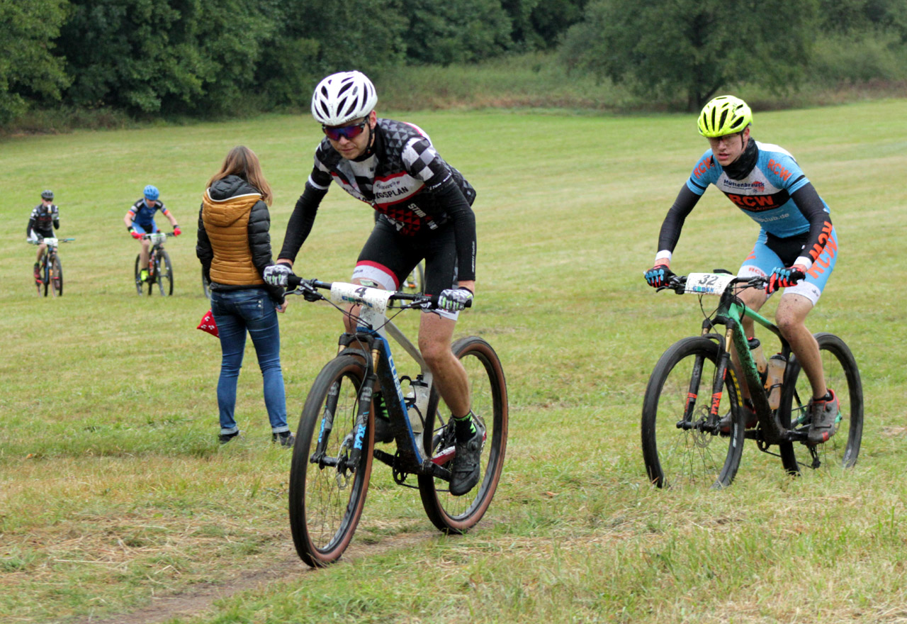 Die Spitze noch in umgekehrter Reihenfolge: Joris Massaer (Startnummer 25) vom Team8s MTB Team ist Belgischer Landesmeister im Mountainbike Marathon der Elitefahrer und wird am Ende Zweiter hinter Mathias Frohn (30) vom Team Firebike Handelshof . Foto: Stephan Dietel