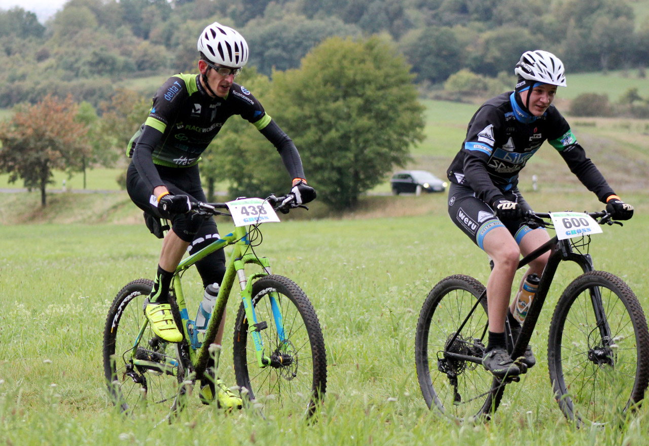 Vereint biken und berichten: Der stellvertretende Radsportnachrichten.com-Redaktionsleiter und Mountainbike-Ressortleiter Matthias Steinberger (links) kam ebenso nicht ungesehen an unserem Fotograf vorbei wie Leander Otto (rechts) vom AMC Rodheim-Bieber. Foto: Stephan Dietel