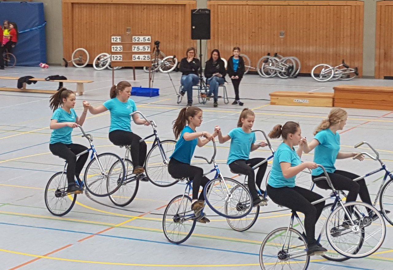 Im 4er Juniorinnen Kunstradsport zeigt die Mannschaft mit Elisa Müller, Tamara Schmidt, Lavinia Huth und Kiara Daubertshäuser auch eine gute Leistung, alle Übungen haben die Sportlerinnen ordentlich gezeigt und sind mit der Ausfühung fast an die Bestleistung von den Bezirksmeisterschaften heran gekommen, trotz eines strengen Kampfgerichtes. Darum belegte die Mannschaft mit ausgefahrenen 73,36 Punkten den dritten Platz. (gke | Foto: Gertrud Kessler)