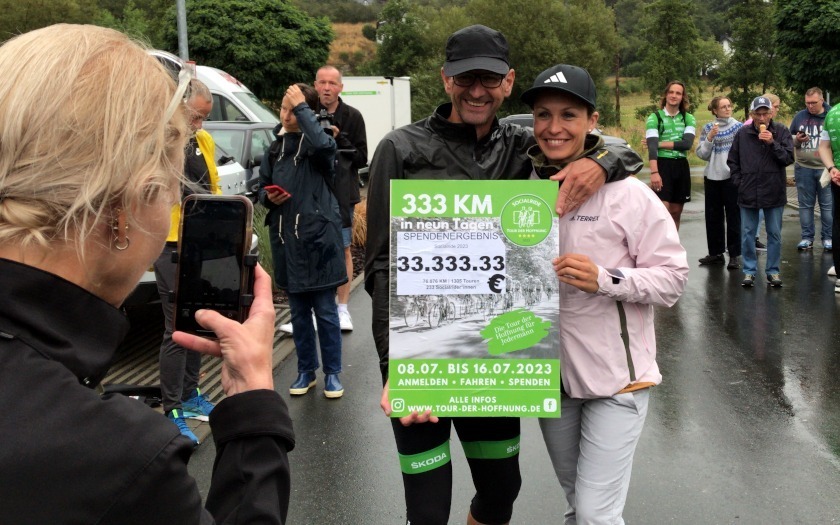 Einen unliebsamen Begleiter konnten sie auch auf den folgenden zwei Etappen nicht loswerden – nur manchmal etwas hinter sich lassen, aber nie ganz abhängen: Den Regen. So war die Tour der Hoffnung eine feucht-fröhliche Jubiläumsfahrt im wörtlichen Sinne, die so schnell niemand mehr vergisst. 1.244.430 Euro, die über alle drei Tage an Spenden eingefahren wurden, tun ein übriges dazu, in die Geschichte der Tour der Hoffnung und ihrer 40. Fahrt einzugehen.