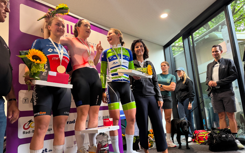 Mit dem neuen Rennmodus in der „Müller – Die lila Logistik Rad-Bundesliga“ hatte man aber auch einen Jungfernflug geplant, der die teilnehmenden Juniorinnen und Frauen gespannt und teilweise nervös machte. In Rennsportkreisen habe sich herumgesprochen: „Gießen enttäuscht nie. Gießen braucht aber Mut“, sagte Marina Steinmüller, die in ihrer Funktion als Sportliche Leiterin, die „Co-Pilotin“ des PZ Gießen Racing Team war. Die Fahrerinnen der Gießener Bundesliga-Mannschaft hatten sich im Vorfeld Mut gemacht und der wurde am Ende belohnt: Sie freuten sich außerordentlich über Platz fünf von Janina Morin Bender im A-Finale und Platz drei von Amelié Hild im B-Finale des neuen Rennmodus, der in Gießen Premiere hatte. Wenn ein Flieger oder eine Fluggesellschaft zum allerersten Mal auf einem neuen Flughafen landet, werden sie mit einer Wasserfontäne begrüßt. So konnte man den Starkregen zur Siegerehrung der Rad-Bundesliga als Willkommensgruß für den erfolgreichen Testflug dieser Neuerung einordnen. Vielleicht waren es schon ein paar Runden zu viel , wenn man jetzt im Hauptgebäude der Sparkasse Gießen ein Flughafen-Terminal vor sich sah. Jedenfalls ging es zur Siegerehrung dort hinein, denn die Ehrung ließ keinen Aufschub zu, auch wenn dann nur noch die Aktiven Platz zum Zuschauen fanden. Sparkassen-Vorstandsmitglied Ilona Roth begleitete das „Boarding“ und die Siegerehrungen.
