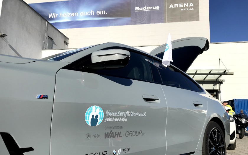 Die große Zahl an Einsatzfahrzeugen von Polizei und Rettungsdiensten vor der Buderus-Arena in Wetzlar fiel sofort auf. Wer aber genau hinsah, konnte erkennen, dass dazwischen Begleitfahrzeuge standen, die mit Fahnen ausgestattet waren und die verkündeten, dass es sich um einen fröhlichen Großeinsatz für den guten Zweck handelte.