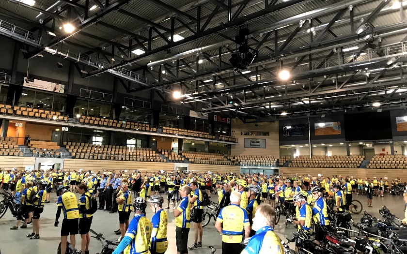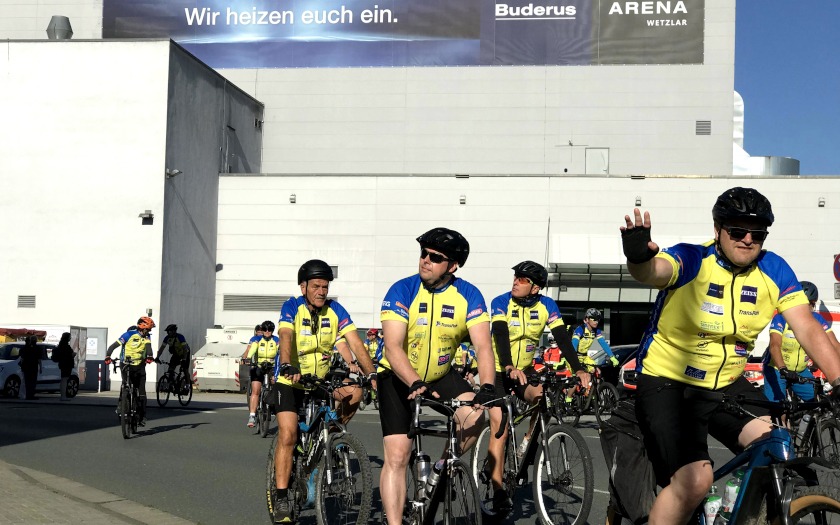 Im Inneren der Buderus-Arena wurde noch viel deutlicher, worum es ging: 500 Menschen in gelb-blauen Radtrikots füllten das Foyer, um zu frühstücken. Es genügte ein Pfiff mit der Trillerpfeife und die Gruppe wechselte in den riesigen Innenraum der Arena. Es folgte die Ansprache des Vereinsvorsitzenden Dieter Greilich mit den wichtigsten Infos dieser Spenden-Radtour, der Reise-Segen für einen guten Verlauf und eine erste Spende zugunsten des Vereins und seiner Arbeit.