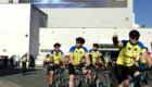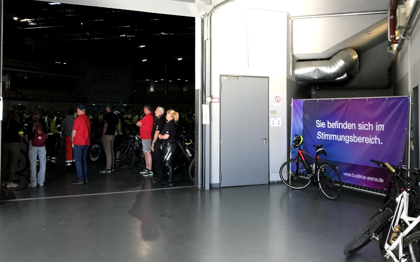 Beim nächsten Pfiff wurde aufgesattelt und die 500 Menschen standen in kaum einer Minute mit ihren Fahrrädern bereit – ausgerichtet zum großen Rolltor an der Seite der Arena. Um kurz nach 8 Uhr wurden dort die Startflaggen geschwenkt und die Fahrt freigegeben, für die große Radtour und den guten Zweck der Menschen für Kinder.