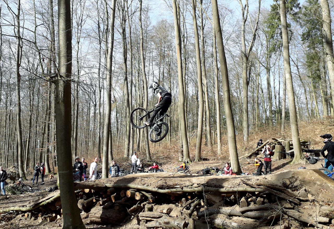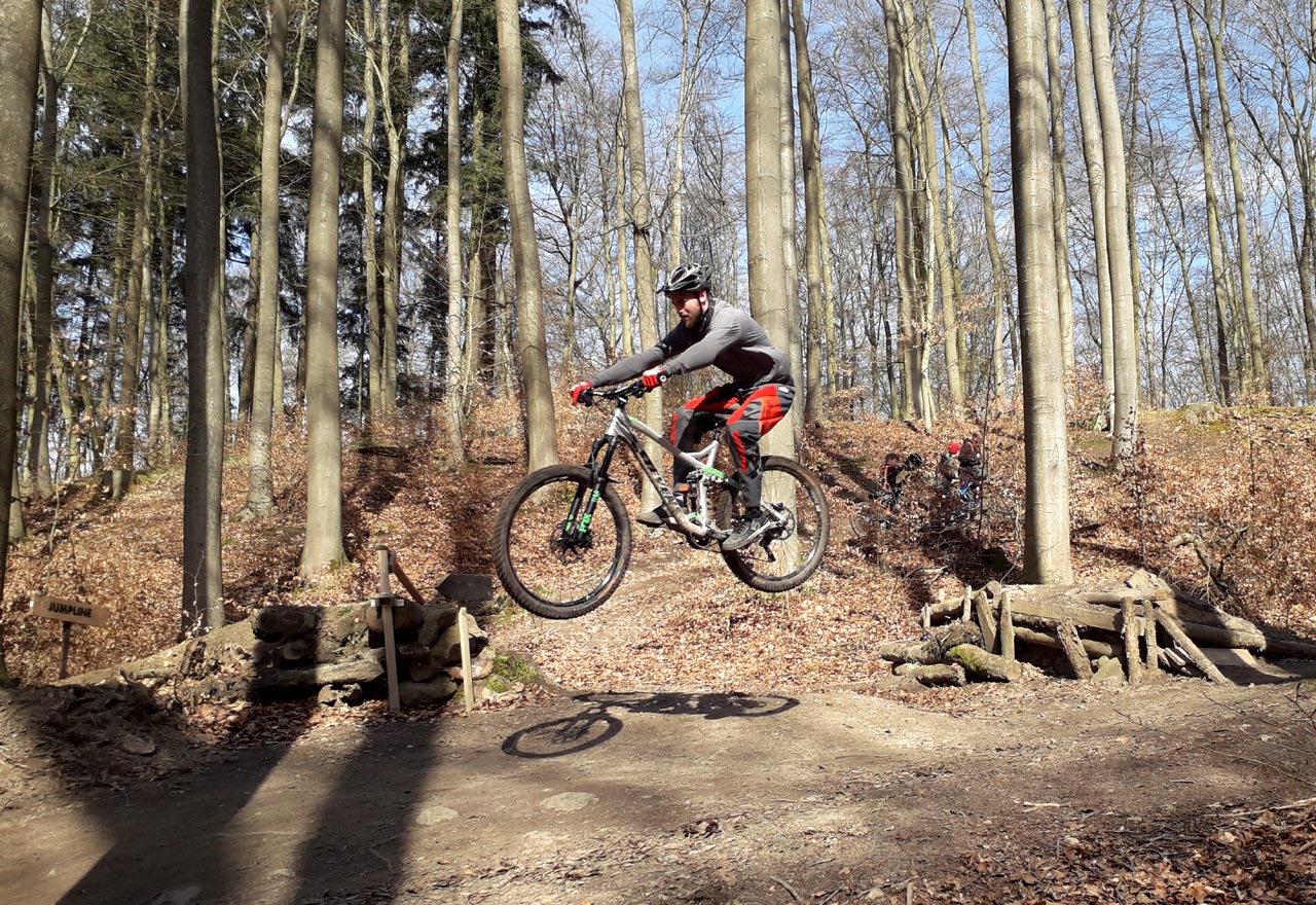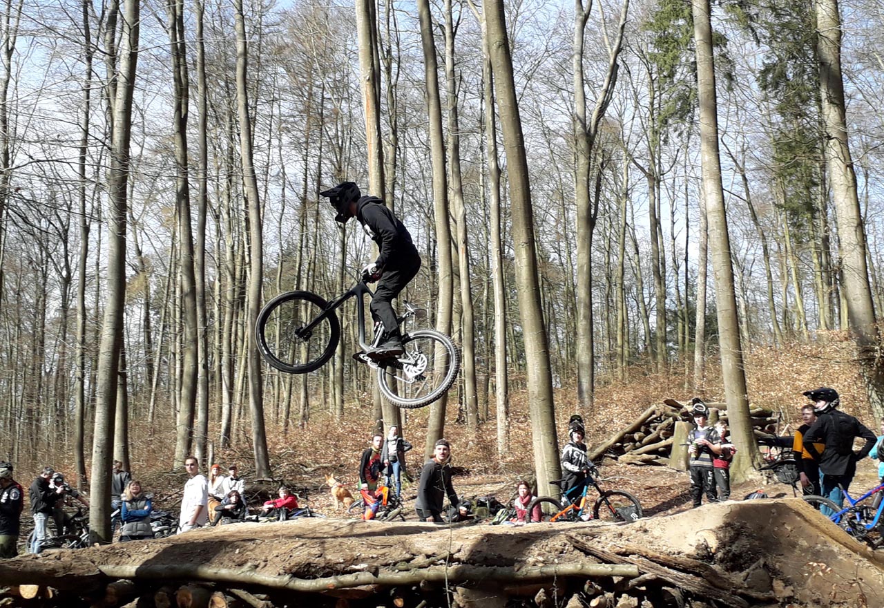 Im aktuellen Ausnahmezustand der Corona-Pandemie ist es kaum vorstellbar, dass vor etwa zehn Tagen noch Veranstaltungen bis zu 100 Personen ausgerichtet werden durften. Blicken wir auf den Sonntag des 15. März zurück, erwachen Erinnerungen eines mittlerweile besonderen Tages. Ein Tag an dem man noch in kleinen Gruppen beisammen stand und seinem Sport nacheifern konnte. So geschehen auf dem Gießener Schiffenberg. Die Abteilung Freeride der Radsportgemeinschaft Gießen und Wieseck eröffnete ihr öffentliches Trainingsgelände. Jedermann konnte vorbei kommen, die für die Saison 2020 neu präparierten Strecken erfahren und an einem zweistündigen Fahrtechniktraining teilnehmen. Letzteres erfolgte höchst persönlich durch den Streckenchef Christian Lengwenat. Für das Wohl der Mountainbikesportler*innen sorgte sich Abteilungschef und Stimmungskanone Alex Luh. Die beiden eröffneten pünktlich um 12 Uhr das Trainingsgelände. Etwa eine Stunde später rückten einzelne Bikesportler nach. Plötzlich waren überall rasante Abfahrten und luftige Sprünge zu bestaunen. Um die gewachsene Community herzlichst zu begrüßen erfolgte eine zweite Ansprache mit nachträglichem Gruppenfoto. Es symbolisiert eine Danksagung an alle Helfer, sowie die Stadt Gießen und des zuständigen Försters. Ohne die Unterstützung vorgenannter Instanzen sind solche legalen Streckenbauten in öffentlich zugänglichen Wäldern nahezu unmöglich.