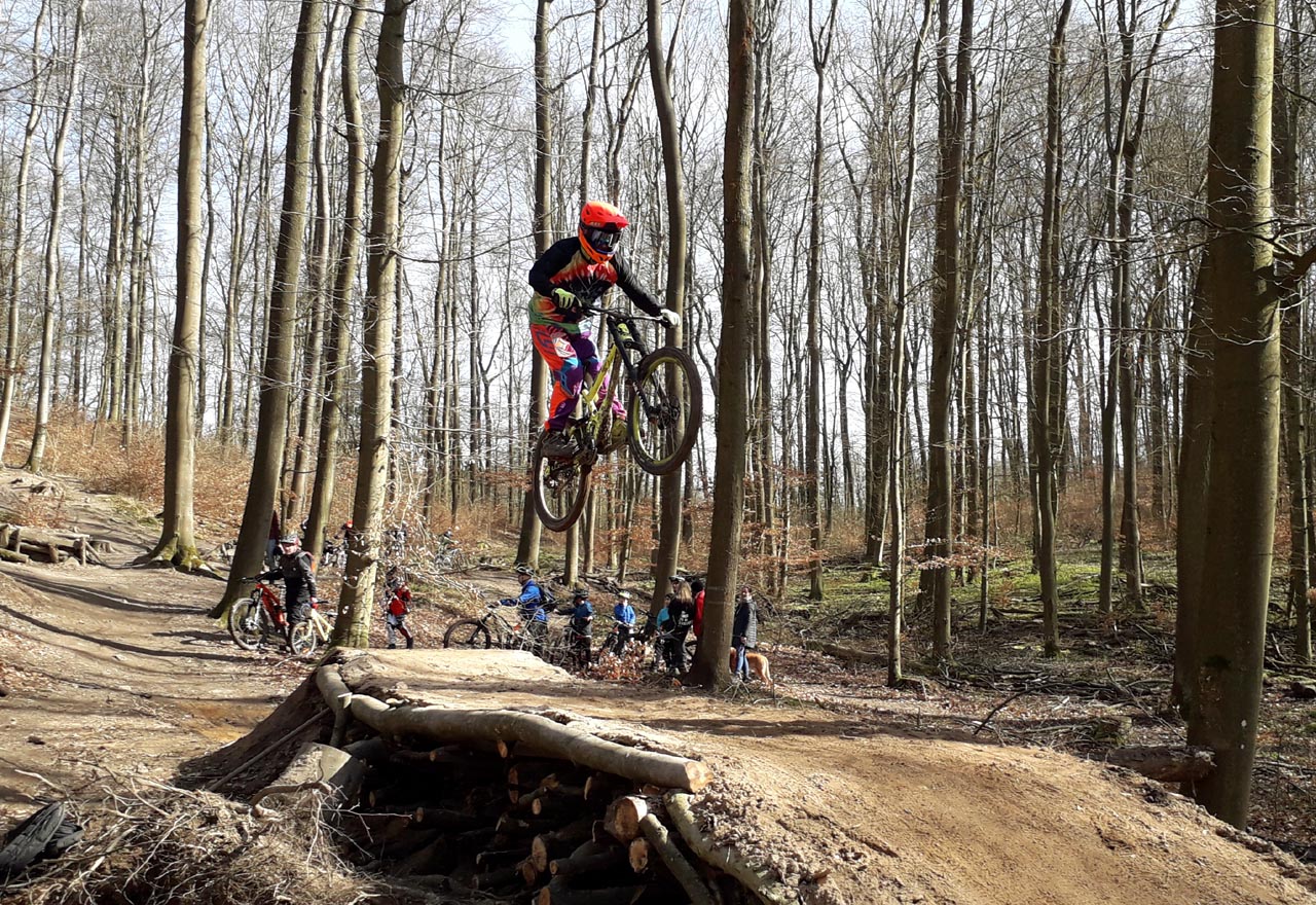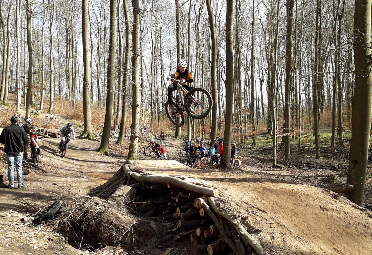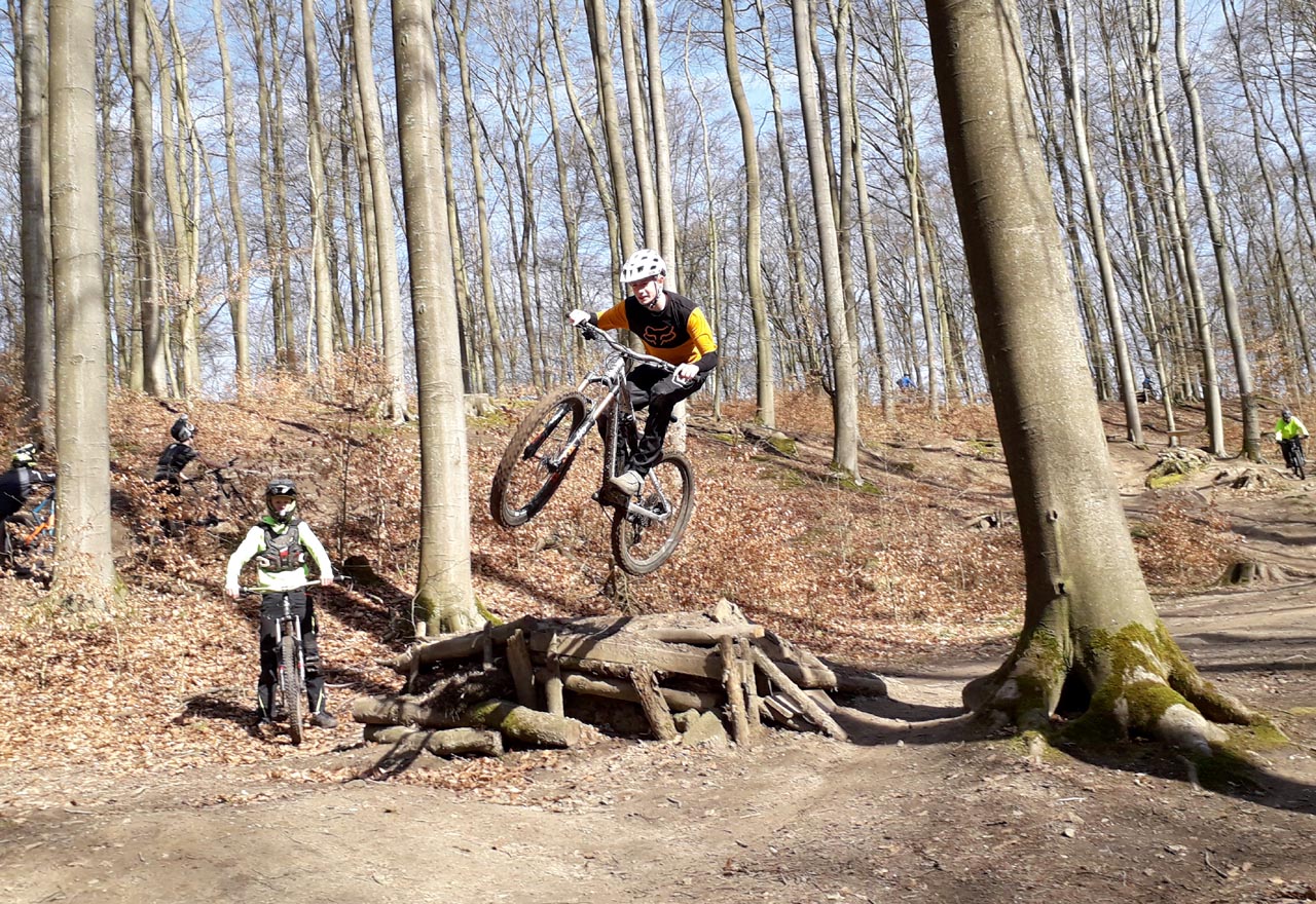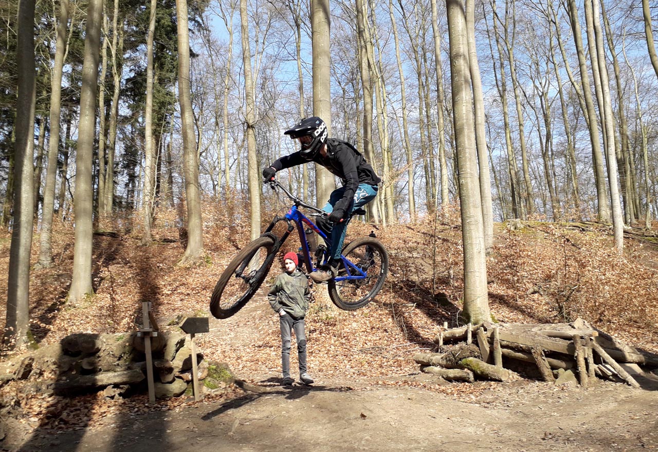 Im aktuellen Ausnahmezustand der Corona-Pandemie ist es kaum vorstellbar, dass vor etwa zehn Tagen noch Veranstaltungen bis zu 100 Personen ausgerichtet werden durften. Blicken wir auf den Sonntag des 15. März zurück, erwachen Erinnerungen eines mittlerweile besonderen Tages. Ein Tag an dem man noch in kleinen Gruppen beisammen stand und seinem Sport nacheifern konnte. So geschehen auf dem Gießener Schiffenberg. Die Abteilung Freeride der Radsportgemeinschaft Gießen und Wieseck eröffnete ihr öffentliches Trainingsgelände. Jedermann konnte vorbei kommen, die für die Saison 2020 neu präparierten Strecken erfahren und an einem zweistündigen Fahrtechniktraining teilnehmen. Letzteres erfolgte höchst persönlich durch den Streckenchef Christian Lengwenat. Für das Wohl der Mountainbikesportler*innen sorgte sich Abteilungschef und Stimmungskanone Alex Luh. Die beiden eröffneten pünktlich um 12 Uhr das Trainingsgelände. Etwa eine Stunde später rückten einzelne Bikesportler nach. Plötzlich waren überall rasante Abfahrten und luftige Sprünge zu bestaunen. Um die gewachsene Community herzlichst zu begrüßen erfolgte eine zweite Ansprache mit nachträglichem Gruppenfoto. Es symbolisiert eine Danksagung an alle Helfer, sowie die Stadt Gießen und des zuständigen Försters. Ohne die Unterstützung vorgenannter Instanzen sind solche legalen Streckenbauten in öffentlich zugänglichen Wäldern nahezu unmöglich.