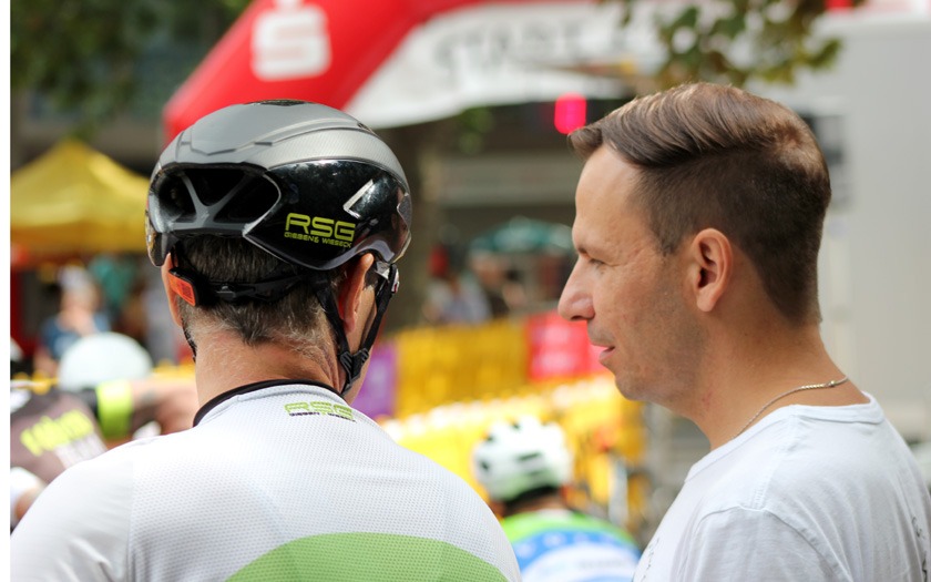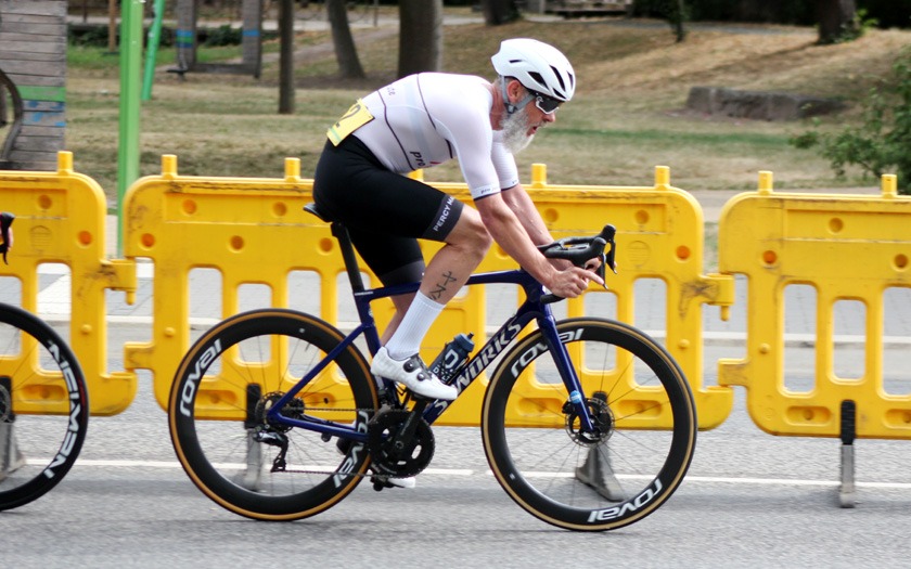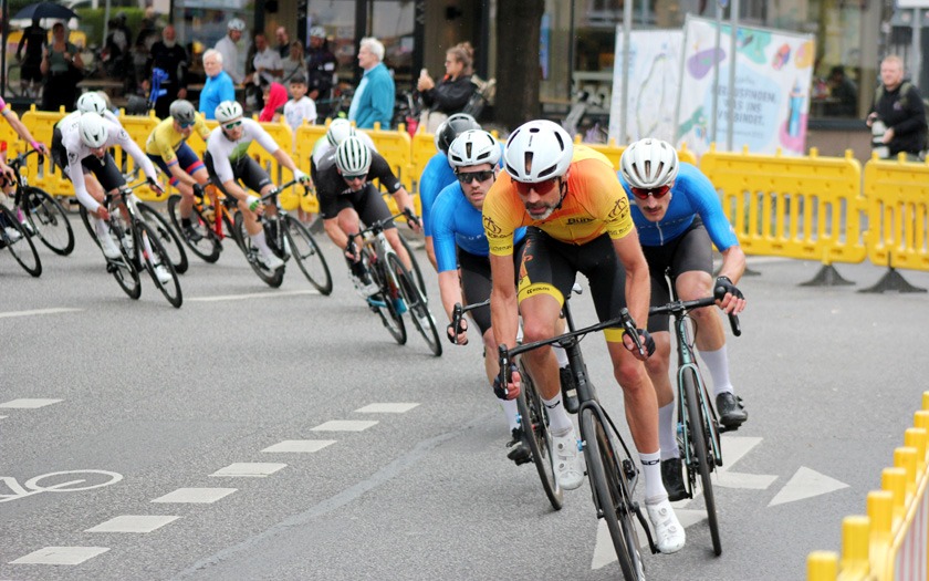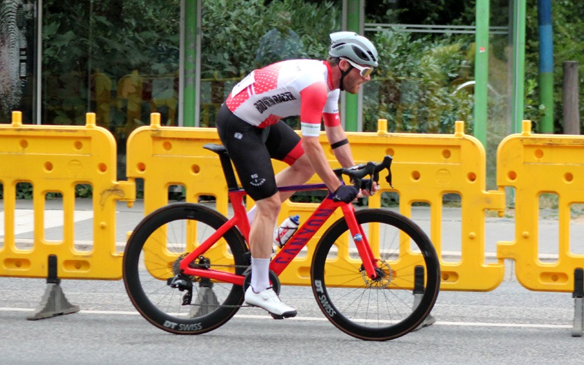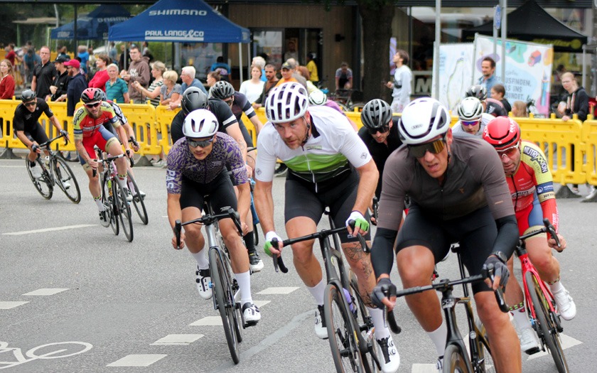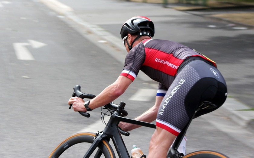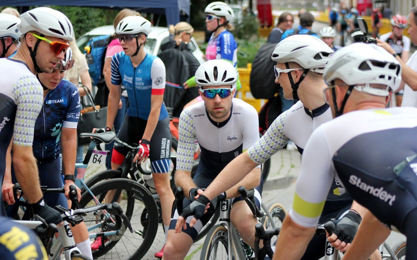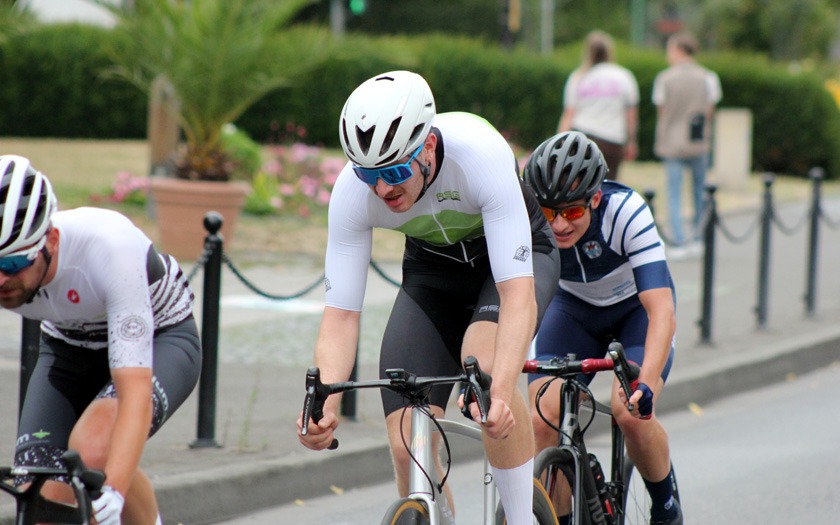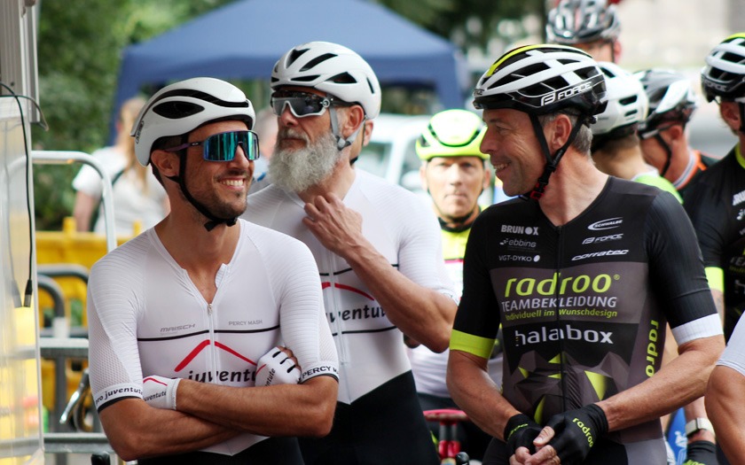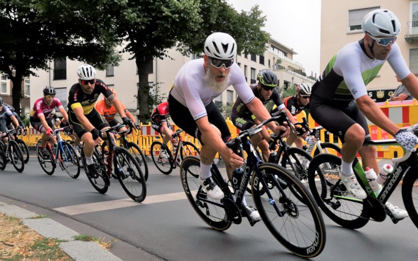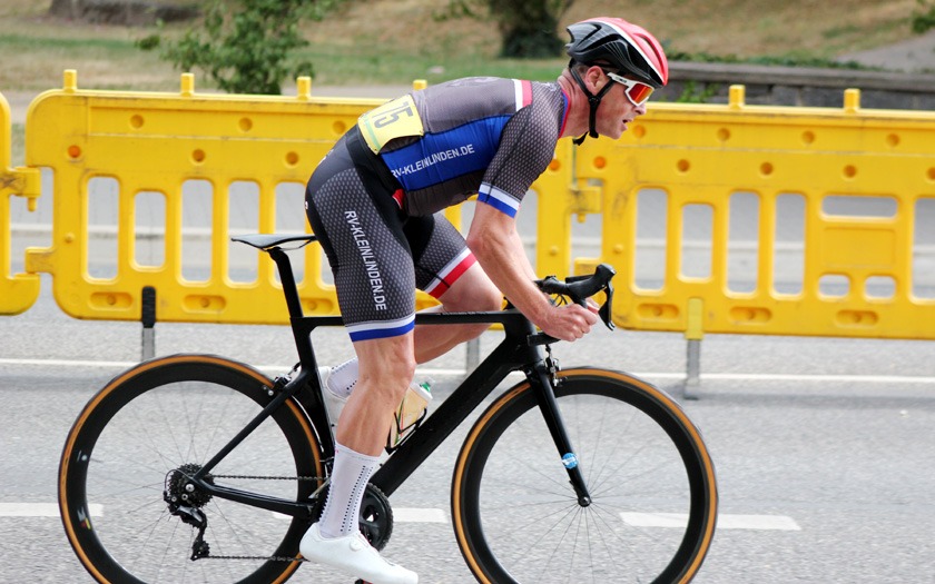 Eine Ansammlung jahrzehntelanger Erfahrung war das Rennen der Masters 2, 3 und 4 über 50 Runden (= 40 km), das Lokalmatador Axel Goers als reinen Kampf ums Ankommen sah. Je nach Altersklasse konnten zehn, zwanzig Jahre Altersunterschied zwischen den Fahrern liegen, die sich im Rennen bemerkbar machten, auch wenn das Tagesergebnis getrennt gewertet wurde. Obendrein war Goers‘ erstes Rundstrecken-Rennen in dieser Saison mit Medaillen-Gewinnern und Titelträgern von Deutschen und Weltmeisterschaften sehr erfahren besetzt. „Der Weltmeister in der Einer-Verfolgung ist gestern nur Sechster geworden“, lieferte Axel Goers eine aktuelle Einschätzung mit Blick auf das Gießener Partner-Rennen am Vortag in Offenbach. Drei Runden vor Halbzeit war Goers nach einer Überrundung zur vorzeitigen Aufgabe gezwungen – dabei gewesen zu sein und es probiert zu haben, war aber eine Selbstverständlichkeit für den vorwiegend im Bahn-Radsport aktiven Gießener. Sehr aktiv unterwegs waren der Kleinlindener Alexander Koop (RV Gießen-Kleinlinden / Radroo Team) sowie Christian Werner und Christian Schmidt von der RSG Gießen und Wieseck, die sich immer wieder bei Sprints und in der Führungsarbeit in Gruppen vorne zeigten. Hinter Sebastian Ventker (RSV Gütersloh) und Hanno Rieping (pro-juventute.org) wurde Christian Werner Dritter der Masters 2. Koop, der schon neun Siege in dieser Saison eingefahren hat, kam auf Platz sechs bei den Masters 3 und Christian Schmidt kam dort auf Platz 15.