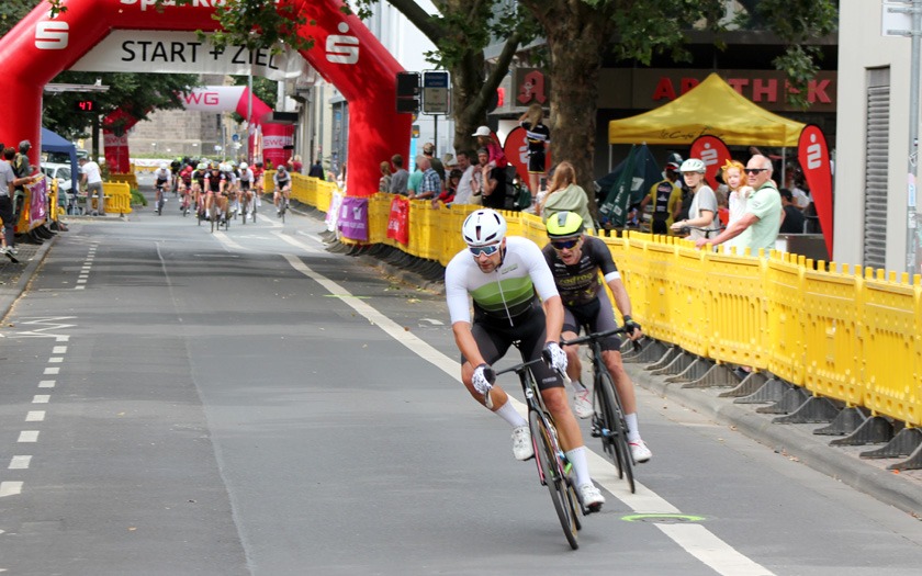 Zum Abschluss des Renntages fuhren die Elite-Amateure der Männer 80 Runden um den Großen Preis der Sparkasse Gießen, der von Christian Noll vom Team Colonia Kids vor Martin Lemme vom Team Superciao und Dominik Ivo vom Team Kern-Haus gewonnen wurde. Die heimischen Fahrer Florian Obersteiner und Stefan Wahner von der RSG Gießen und Wieseck kamen auf die Plätze fünf und 14, nachdem sie sich gegenseitig bei Attacken und Ausreißversuchen unterstützt und auf eine Fluchtgruppe gehofft hatten. Doch gegen die in stärkerer Zahl angetretenen Teams, die ihren Teil zum Durchschnittstempo von beachtlichen 48,5 km/h beitrugen, konnten sie zu zweit nichts ausrichten, wenngleich sie sich ein paar Prämien und im Fall von Florian Obersteiner auch Punkte schnappen konnten. Stefan Wahner freute sich, durch Platz vier aus einer Fluchtgruppe am Vortag in Offenbach und mit Platz 14 in Gießen, dann Platz drei in Gesamtwertung beider Rennen ergattert zu haben. Die gute Stimmung der Rennen ließ auch ihn das Ende einer stressigen Woche aus Arbeit und Studium nach zwei aufreibenden Radrennen zufrieden abschließen.