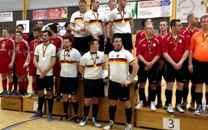 Waldrems musste zuerst schießen und Jascha Wagner im Tor der Teutonen parierte glänzend von halber Höhe. Der Krofdorfer Kapitän und sicherste Strafstoßschütze Sascha Götz trat als erster für die Wettenberger an. Sein platzierter Schuss von halber Höhe wurde vom Waldremser Schlussmann glücklich pariert. Nach wie vor stand es 0:0. Luca Wagner war der nächste Krofdorfer Schütze. Und wieder blieb der Tormann Sieger. Wagner schoss gut, doch der Torhüter hatte sich für die richtige Ecke entschieden. Nun war Waldrems wieder am Zug. Jascha Wagner rettete mit einer artistischen Reaktion und es blieb damit beim 0:0. Der Letzte Schütze konnte nun die Entscheidung bringen. Für Krofdorf trat Routinier Thomas Abel an. Er verwandelte sicher hinten hoch und alles was danach kam war grenzenloser Jubel. Endstand: Krofdorf – Waldrems 1:0 und der dritter Deutsche Meistertitel war in eigener Halle geschafft. (mw | Foto: Martin Wagner)