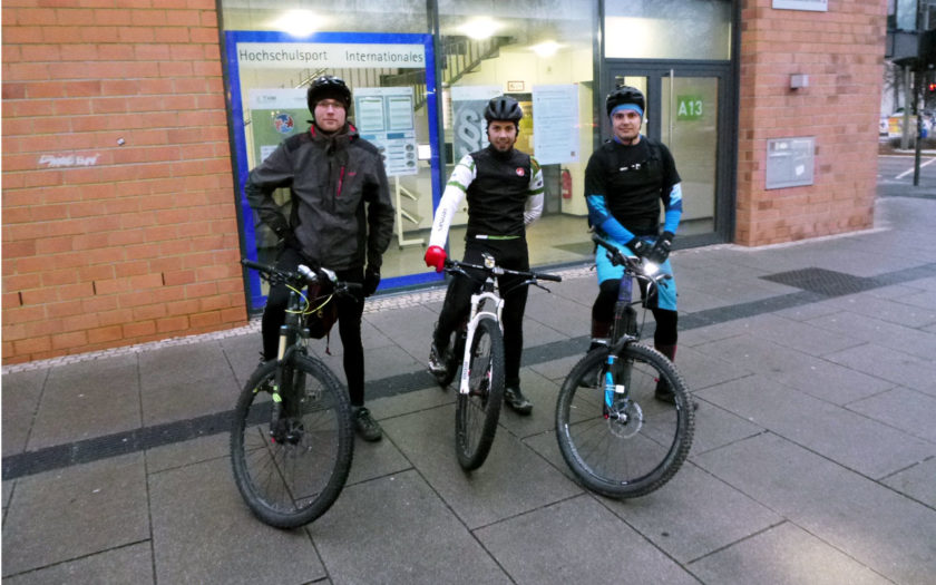 Es gibt nicht viele von ihnen, noch weniger im Freizeitsport, aber es gibt sie: hart gesottene Sitzsportler, die selbst im Winter bei kalten, stürmischen und nassen Bedingungen freiwillig durch die früh einbrechende Dunkelheit pedalieren. Augenscheinlich standen mir vergangenen Donnerstag am Gießener THM Gebäude A13 mit Patrick, Sven und Vincent nur drei Mountainbiker gegenüber – doch es steckt mehr dahinter. Zu Beginn des Kurses versammelte sich eine bunt durchmischte Gruppe aus Anfängern, Fortgeschrittenen und Wettkampf erfahrenen Mountainbikern. Darunter auch eine Mountainbikerin. Unterschiedlichste Leistungsklassen, die gemeinsam durch die umliegenden Wälder rollten. Bergauf und bergab auf breiten und schmalen Pfaden. Es ist keine leichte Aufgabe ihnen allen hinsichtlich der Geschwindigkeit und dem fahrtechnischem Anspruch gerecht zu werden. Sie unternahmen Touren die Kursleiter Vincent, je nach Situation, für die Vermittlung diverser Fahrtechnik-Übungen nutzte. Jedenfalls solange es noch hell war, denn es wurde schnell dunkel. Nach der Zeitumstellung schaltete man bereits zum Start der Treffen (17 Uhr) die Beleuchtung an – und verschwand aus der dämmerigen Stadt in den dunklen Forst. Zum Treffpunkt erschienen immer weniger Teilnehmer. Bekannt ist, dass sich einer von ihnen außerhalb des Kurses verletzte. Einem weiteren kreuzten umgelegte Vorlesungen den Weg. Es bleibt auch zu vermuten, dass so manche den Fahrtwind bei Temperaturen um den Nullpunkt scheuten – so einer bin übrigens auch ich. Eine unzureichend starke oder fehlende Beleuchtung könnte ebenfalls ein Ausschlusskriterium gewesen sein. Letztlich bildete sich eine kleine Gruppe aus den eher konditionell stärkeren Teilnehmern, die sich bestens ausgerüstet an nahezu jedem Termin trafen.