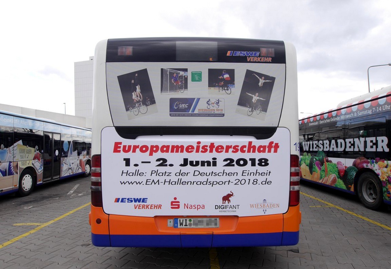 Im Wiesbadener Nahverkehr wird seit einigen Tagen auch für die Hallenradsport-EM geworben: Zwei Linienbusse tragen auf dem Heck die Werbebotschaft der EM. „Diese Busse bringen Euch sicher zur Veranstaltung. Steigt ein und kommt. Eine tolle Show von Weltklasseathleten garantiert Freude und Spaß“, freut sich Organisationsleiter Johann Ratay über die Unterstützung der ESWE Verkehrsgesellschaft mbH, dem Betreiber des Öffentlichen Personennahverkehrs in der hessischen Landeshauptstadt Wiesbaden.