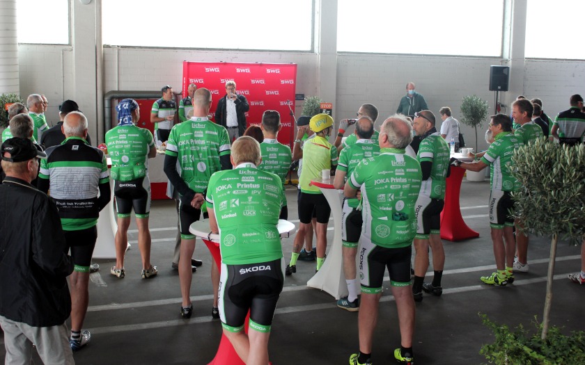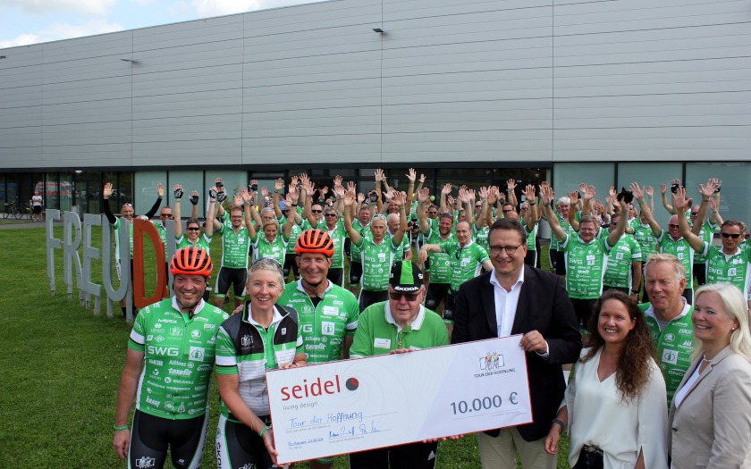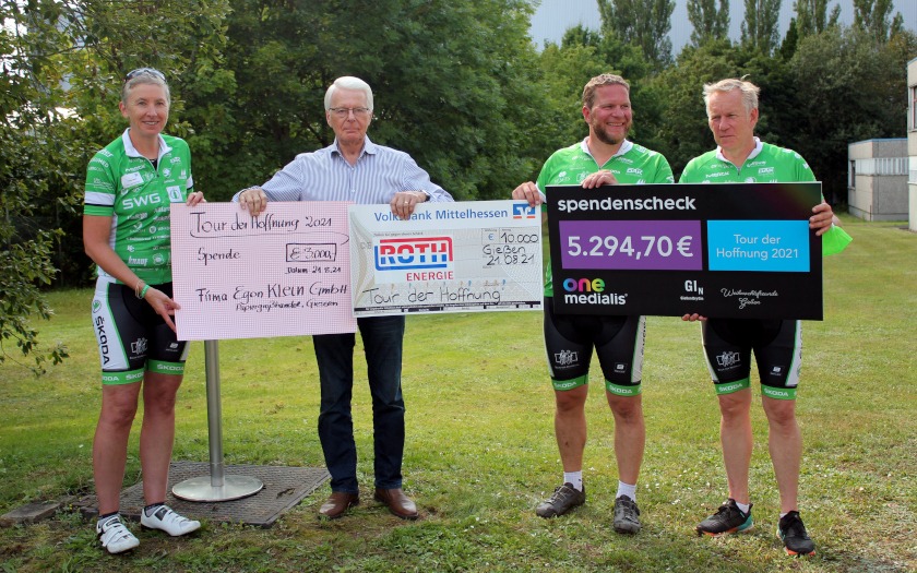 Die ehemalige Biathletin Petra Behle, als Schirmherrin der Tour der Hoffnung, war froh darüber, die Spendenradtour wieder mit Leben füllen zu können, nachdem man im vergangenen Jahr nur mit einer ganz kleinen Gruppe auf einer spontanen Tour unterwegs sein konnte. So erinnerte der Lindwurm der Radfahrenden in grünen Trikots und mit gelben Helmüberziehern bei seiner Fahrt durch Mittelhessen schon sehr an die Auftaktveranstaltung aus früheren Jahren. Und spätestens bei der Spendenbereitschaft der Unternehmen, die man auf zahlreichen Zwischenstopps besuchte, ließ fast vergessen, dass dies nur die kleine Ausgabe der Tour der Hoffnung war. Die Spendenschecks wurden so reichlich gezückt, dass es schwerfiel mitzuzählen, wie groß denn die Gesamtsumme der Ausfahrt sein könnte. Auch das ist eine Tradition der Tour der Hoffnung, die ihren Spendenerlös erst am Abschlussabend verkündet: 483.540 Euro, und damit deutlich mehr als die angepeilten 250.000 Euro kamen bei der diesjährigen Tour für den Kampf gegen Krebs zusammen.