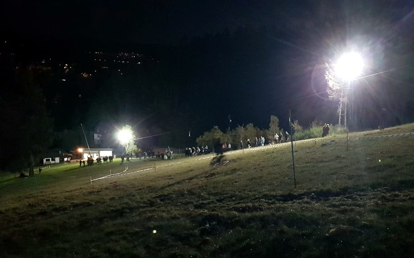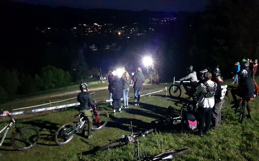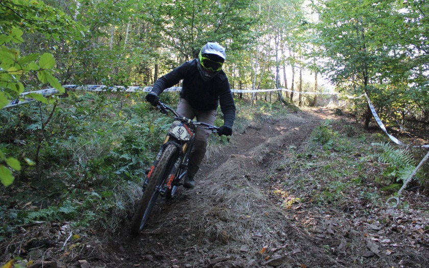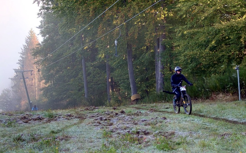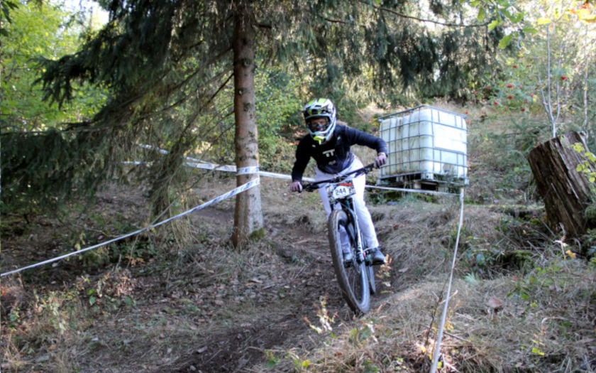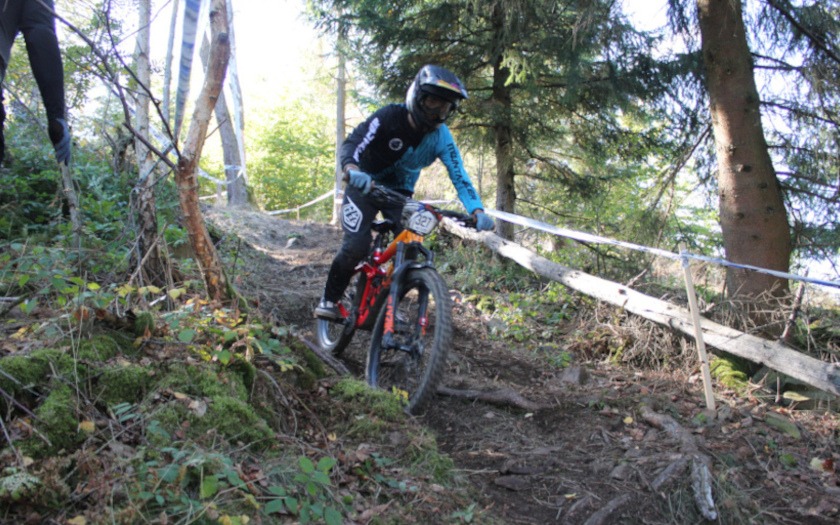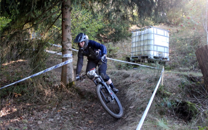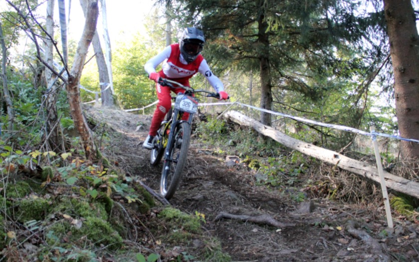 Dass er zum ersten Training am Freitag (07.10.) ausgerechnet die Startnummer 13 bekam, war für den Aßlarer Felix Schmidt aber kein Grund zur Sorge. Kopfüber am Lenker montiert, sollte die Wirkungen der von manchen als Unglückszahl empfundenen Zahl „13“ ohnehin aufgehoben sein. Der 25-jährige fährt mit Rennlizenz vom TV Wetzlar und konnte damit auch an der Hessenmeisterschaf teilnehmen, die nach rund zehnjähriger Pause in dem Rennen unter den Hessinnen und Hessen mit Rennlizenz mit ausgefahren wurde. Das Startgeld von 50 Euro pro Person war aus Sicht von Felix Schmidt schon deshalb in Ordnung, weil an diesem Wochenende der Skilift viele Stunden in Betrieb war und die Sportlerinnen und Sportler an drei Tagen zum Kennenlernen der Strecke auf den 535,3 Meter hohen Haidackerskopf brachte, an dem der Skihang des Ski-Club Kleingladenbach liegt. Am Samstagabend (08.10.) fand hier noch ein Dual-Slalom-Wettbewerb unter Flutlicht statt, der das Rennwochenende zur Halbzeit schon krönte.