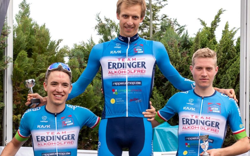 Im Rennen der Senioren II und III fuhr Christian Schmidt von der RSG Gießen und Wieseck nach 51 Kilometern auf Platz zwei hinter Markus Bandura vom RC Silber-Pils Bellheim. Und auch im Rennen der Elite-Amateure gab es mittelhessische Podiumsplätze, auch wenn diese auf den ersten Blick nicht zu erkennen waren, denn das Podium war durch die Teamkollegen Georg Loef (RSV Seeheim), Philipp Küllmer (RC Silber-Pils Bellheim) und Simon Redmers (RV Stuttgardia Stuttgart) ganz ins Blau des Team Erdinger Alkoholfrei getaucht. Mit Tagessieger Loef und dem Drittplatzierten Redmers standen gleich zwei Wahl-Gießener auf dem Treppchen, die dem Rennen nach 77 Rennkilometern erfolgreich ihren Stempel aufdrückten. (sd | Foto: Thomas Laut (riedgras.de))