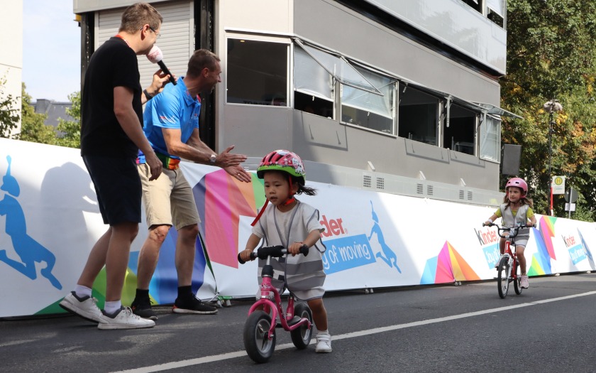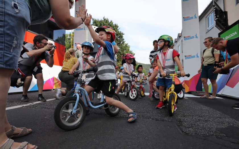 Rosa Striche auf der Deutschhausstraße ließen am Vorabend erkennen, wo am nächsten Tag die alles entscheidende Stelle, der Zielstrich, dieser zweiten Etappe der Deutschland Tour sein würde. Am Freitagvormittag startete auf dem Firmaneiplatz ein Radsportfest rund um die Deutschland Tour, den Radsport und den Radverkehr in der Stadt. Die Zeit bis zum Eintreffen der Radprofis am späten Nachmittag verging damit schnell. Um 12:30 Uhr konnten alle Radfahrenden bei der Techniker Ride Tour einen Teil der späteren Schlussrunde des Profi-Rennens selbst abfahren. Die Brüder Gerrit und Lennart Randau nutzten die Gelegenheit, in ihrer Heimatstadt über die Strecke zu fahren, an der sie damals gewohnt haben. Gerrit Randau, der inzwischen im flachen Münsterland lebt, freute sich auf eine Strecke mit Steigungen und tippte für das Finale der Radprofis auf Simon Geschke. Bruder Lennart Randau hoffte auf Nils Politt. Ein Bruder-Duell der beiden Randaus am Zielstrich, sollte es nach der 45-minütigen Ausfahrt aber nicht geben, denn sie waren auf sehr unterschiedlichen Fahrrädern unterwegs und ein ungleicher Kampf hätte vielleicht den einen den Schlafplatz bei dem anderen gekostet. Die Tour sollte sowieso kein Rennen sein, sondern zeigen, wie Radfahren auf autofreier Stecke in der Stadt empfunden werden kann. Der ehemalige Radprofi Jens Voigt war mit der „kinder Joy of Moving Mini Tour“ zur Stelle, um den Jüngsten das Radfahren schmackhaft zu machen. Eine Parade aller anwesender Kinder über die Zielgerade war ein tolles Bild und eindrucksvoller Moment für die jüngsten Radfahrenden in Marburg. Fürs Podium tippte Voigt auf Alberto Bettiol oder Nils Politt und einen Sprint einer kleinen Gruppe aus 30 bis 40 Fahrern. Er sollte damit in weiten Teilen richtig liegen.