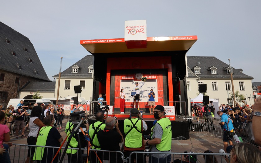 MARBURG – Der Blick aus dem Fenster des Pressezentrums rüber zur Elisabethkirche hatte plötzliche eine ganz andere Wirkung auf Birgit Heimrich, die Leiterin des Fachdienst Presse- und Öffentlichkeitsarbeit der Stadt Marburg. Aus einem Paket Arbeit sei plötzlich eine Party geworden, fasste sie den Tag der Etappenankunft zusammen. Sehr beeindruckt von den Impressionen dieser Zielankunft in Marburg, saß sie nach dem Rennen mit Mitarbeiterin Patricia Grähling im Getümmel der Medien dieser Deutschland Tour. In Texten, Fotos und bewegten Bilder wurde in 190 Länder aus dem Pressezentrum rund um den Tag, das Rennen und die Stadt berichtet. Die Stimmung auf dem Firmaneiplatz ließ sie fast vergessen, wieviel Birgit Heimrich, ihr Team und die Fachdienste der Stadt gemeinsam geleistet hatten, um alles an diesem Tag sicher zu gestalten und zu organisieren.