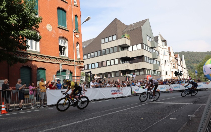 In der Abfahrt Richtung Cappel versuchte sich Nils Politt mit einer Attacke in Schadensbegrenzung für sein Team, doch er konnte nicht zur Ausreißergruppe aufschließen. Kaum war die eine Prüfung gemeistert, folgte die nächste: Im Anstieg am Hasenkopf wurde weiter attackiert und dezimiert. Hier gab es, wie schon in Amöneburg, als dritte von vier Bergwertungen des Tages, Punkte zu holen. Aber auch auf der Abfahrt durch Ockershausen mussten die Fahrer hellwach sein, denn schlechter Straßenbelag und Kurven waren hier eine herausfordernde Kombination. Diese Stelle passierten sie später ein zweites Mal, nach dem sie durch den Zielbereich auf der Deutschhausstraße, vorbei am Firmaneiplatz, gefahren waren. Jede Lücke an der Strecke schien mit radsportinteressierten Menschen gefüllt zu sein. Die kleine, enge Stadt zeigte riesige Begeisterung für die Deutschland Tour. Mit lauten Anfeuerungsrufen und Getrommel an den Werbebanden ging es auf die 17 Kilometer lange Schlussrunde, die den 116 Radprofis in Marbach direkt wieder einen Anstieg in den Weg stellte.