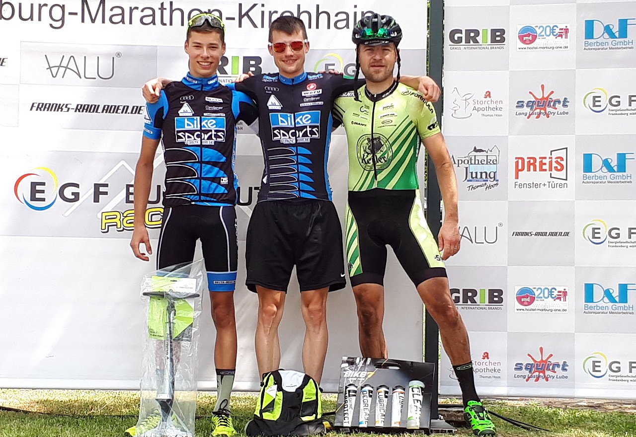 Ein starke Leistung lieferten auch die nordhessischen Radsportler Thorsten Damm (Scott-Fahrradladen Gudensberg) und Max Feger (Focus Rapiro Racing), die beide mit Lizenz der MT Melsungen starten, über die Marathonstrecke ab. In der Eliteklasse mischte Feger, Hessenmeister von 2017, auf der Rennstrecke in Kirchhain zwar wieder ganz vorne mit, konnte aber die Verteidigung seines Titels nicht wahrmachen. Er landete am Ende hinter Julian Stumpf (TGV Schotten) und Sascha Starker (SSG Bensheim) auf dem Bronzerang. Thorsten Damm siegte in der Masterklasse Senioren III souverän und erreichte damit sein Ziel, zum 20. Mal ganz oben in Hessen zu stehen. In diesem Jahr hatte er bereits den Titel in der Disziplin Cross-Country errungen. Thomas Hockauf von der RSG Gießen und Wieseck wurde Vize-Hessenmeister. Bei den Senioren I kam Florian Gaul (SSV Bunstruth/EGF Bunstruth Racing/Franks Rad Laden) vor seinem Vereins- und Teamkollegen Tobias Schmidt und Andreas Kramer (Radwerk Upland/Focus RAPIRO Racing ) zur Hessenmeisterschaft.