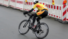 Zum Rennen der Männer Amateure war die zwei Kilometer lange, anspruchsvolle Runde durch die Sattlerstraße, Schreinerstraße, Schlosserstraße, Formerstraße und Schusterstraße noch nass – während der angesetzten 30 Runden (= 60 km) sollte sie aber abtrocknen und den Tag trocken bleiben, wie unser Video vom Renntag zeigt. Schon die ersten Rennkilometer der Amateure zeigten, wie die Strecke durch ihr welliges Profil zu einer natürlichen Selektion führt und schon nach drei Runden fielen erste Fahrer deutlich zurück. Die Fahrweise der 29 angetreten Fahrer verschärfte diese Situation, wie Daniel Schulz-Thomé von der RSG Buchenau später schilderte: „Nach den ersten zehn Runden war ich richtig im Eimer. Schnell, langsam, schnell, langsam. Die ständigen Tempowechsel waren echt nervig“. Doch dann fand der Lokalmatador sein Tempo und eine Gruppe, mit der er das Rennen sicher ins Ziel brachte. Als 16. und damit sechs Plätze besser als im Vorjahr, war er mit seinem Abschneiden im Ziel sehr zufrieden und behielt sein Lächeln bei seinem Heimrennen zum hessischen Saisonauftakt bei.