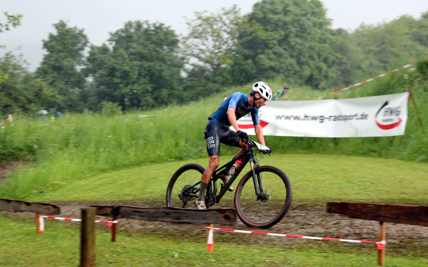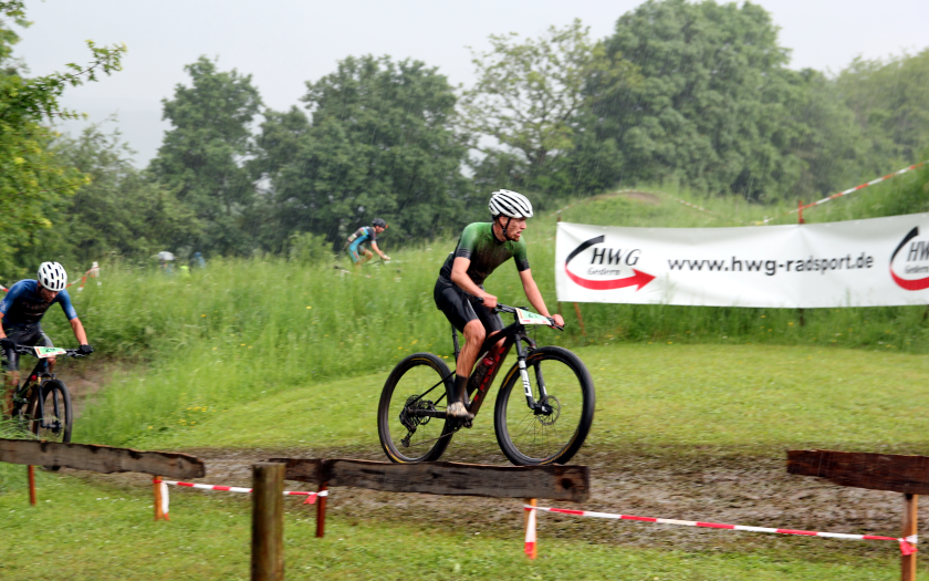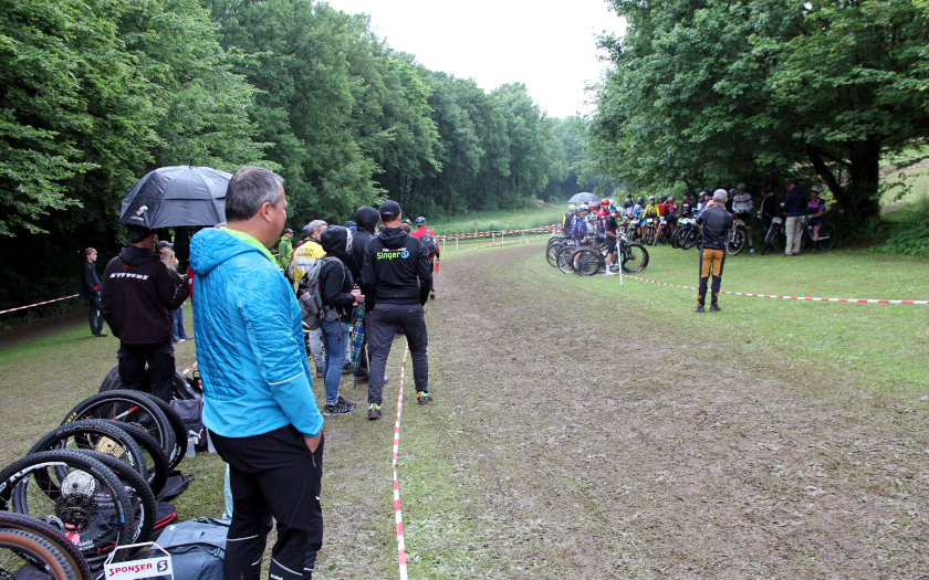 Zum Rennen der Männer waren die Wetter-Bedingungen dann alles andere als glänzend. Zu Beginn des Herrenrennens öffnete der Himmel ein weiteres Mal an diesem Tag die Schleusen und sorgte für ein extremes Regenspektakel in Gedern, weshalb das laufende Rennen um eine Runde verkürzt wurde.