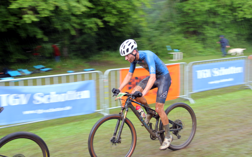 Der amtierende deutsche Meister Maximilian Brandl (Lexware Mountainbike Team) kam mit denn nassen Bedingungen am besten zurecht und sicherte sich souverän seinen ersten Bundesligasieg in der Saison 2024. Der Wahl-Freiburger setzte sich bereits in der ersten Runde an die Spitze und baute seinen Vorsprung schnell auf circa 20 Sekunden aus. In der Folge spielte vor allem das Wetter verrückt: Ein aufziehendes Gewitter sorgte zwischenzeitlich für Stirnrunzeln bei den Kommissären, ob das Rennen überhaupt zu Ende gefahren werden kann. Brandl handelte sich indes an der Spitze einen Plattfuß ein, sodass die Konkurrenz wieder aufschließen konnte, doch nach dem kurzen Boxenstopp drückte der Lexware-Fahrer direkt wieder aufs Gas und setzte sich erneut ab.