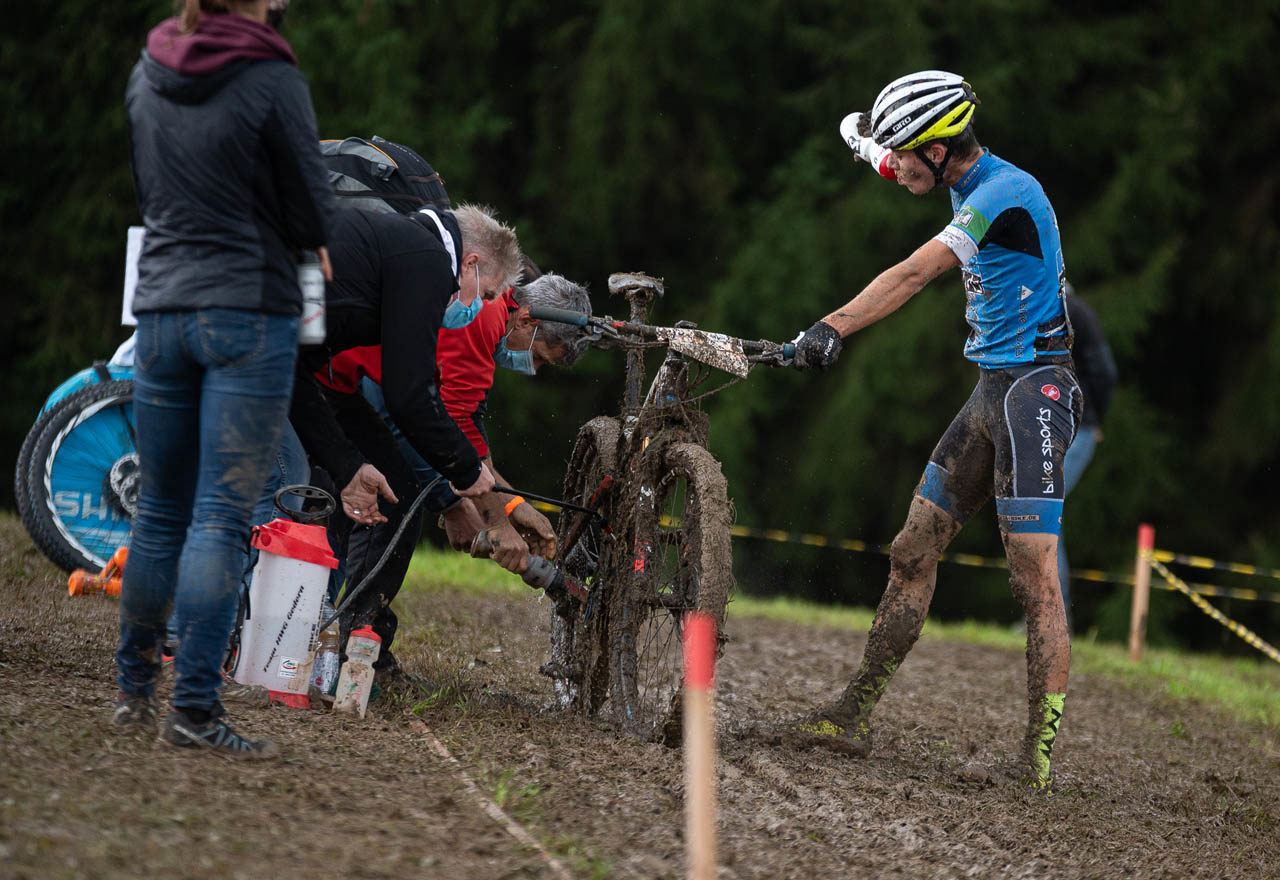 Am vergangenen Samstag (24.10.) erfolgten im südbayerischen Obergessertshausen für die Altersklassen der U19, Elite und Masters die deutschen Meisterschaften im Cross Country. Es ereigneten sich Rennen unter extremsten Bedingungen, die so schnell keiner der teilnehmenden Fahrer*innen und Betreuer vergessen wird. Starke Regenfälle sorgten bereits vor den Rennen dazu, dass die Strecke einem wahrhaftigen Schlachtfeld ähnelte. Das saftige Grün der Wiesen war nur noch neben dem Absperrband zu erkennen. Die anspruchsvoll angelegten Waldpassagen waren teilweise lediglich neben dem Rad laufend oder rutschend zu bewältigen. Das galt sowohl bergauf, als auch bergab. Wer sich bereits ein klassisches Cyclocross-Rennen vor Augen führte, kann die Bedingungen in Obergessertshausen bestens einordnen.