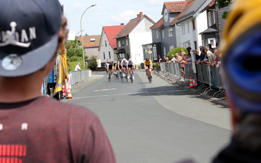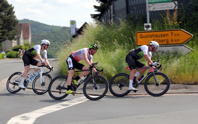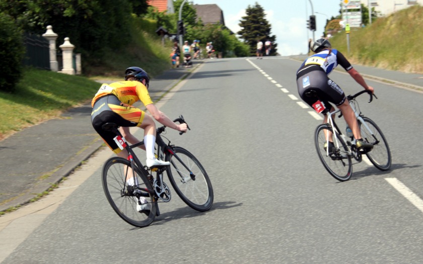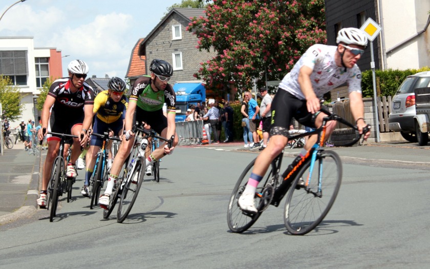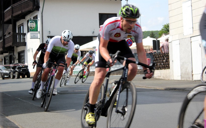 Das Hauptfeld aus den Mastersklassen 3 und 4, sowie Elite Frauen und Elite FT hatte sich gleich zu Beginn in zwei Gruppen geteilt. Ein entscheidender Vorstoß wollte aber niemanden gelingen und so konnte sich Koop, der für die RV Gießen-Kleinlinden und das radroo Team fährt, voll auf einen Sprint konzentrieren. Die kleinere Übersetzung geriet für ihn dabei in Vergessenheit, doch er musste in den Positionskämpfen auf der Anfahrt zum Ziel in der letzten Kurve den längeren Weg um einen Kontrahenten herum wählen, so dass ihm am Zielstrich ein paar Zentimeter zum Tagessieg fehlten. Den schnappt sich Dieter Schwan (RIG Vorderpfalz) vom Team Beacon – Drinkuth Masters. Dritter wurde der Bad Endbacher Bernd Pfeiffer (Sportler ruft Sportler). Platz fünf ging an Christian Schmidt von der RSG Gießen und Wieseck und sein Vereinskollege Thomas Hockauf freute sich nach langer Knieverletzung über die eingefahrenen 38,5 Rennkilometer, die ihn bald wieder zu gewohnter Stärke führen sollen. Martin Nissel von der RV Gießen-Kleinlinden wurde Zehnter.