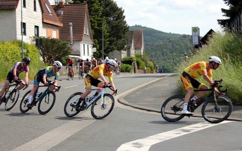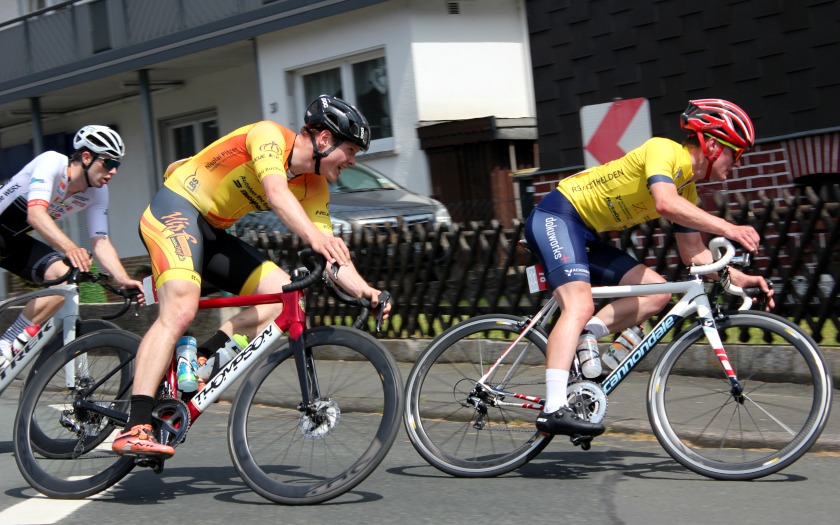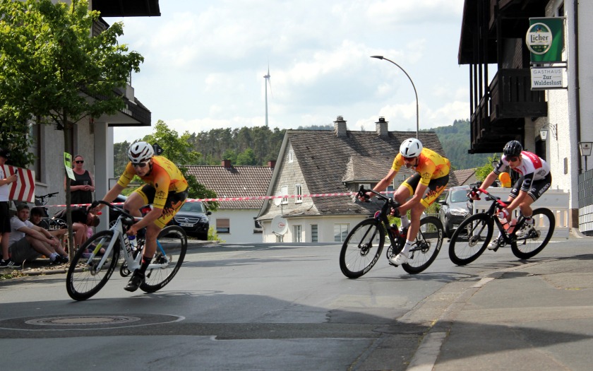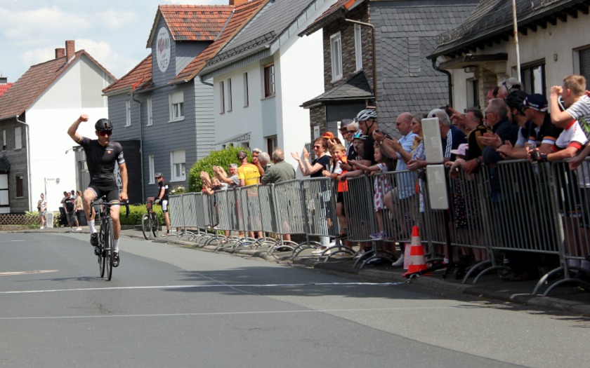 Dass er im Rennen der Amateure als Dritter auf dem Podium stand, überraschte Christian Werner von der RSG Gießen und Wieseck auch noch Minuten nach dem Zieleinlauf. Werner war zu dieser Saison von der RSG Buchenau nach Gießen-Wieseck gewechselt, um noch mehr mit Teamtaktik fahren zu können. Genau das sollte sich so früh in der Saison schon für ihn auszahlen. Bastian Müller (RC Victoria Neheim / Siena Garden Racing Steinfurt | Münster MTB) war 15 Runden vor Schluss ausgerissen, um sich den Tempowechseln im Fahrerfeld zu entziehen und ein gleichbleibend hohes Tempo zu fahren, wie er aus Mountainbike Marathons gewohnt ist. Ihn konnte niemand mehr einfangen, so dass sein Sieg nach 60 Runden (66 km) eine sichere Sache war. Dahinter hatte sich Dominik Hennes (TV Attendorn 1900) bei den Verfolgern mit einigen Metern abgesetzt und Platz zwei geschnappt. Dann gab es ein Sprintfinale, das nicht viel knapper hätte ausgehen können. Wohl eher Millimeter statt Zentimeter trennten Christian Werner auf Platz drei vom undankbaren vierten Platz, der an Yannic Distel vom RSV Düren ging. Mit großem Dank an seinen Vereinskollegen Sebastian Schubert auf Rang neun, der gut für ihn gearbeitet und den Sprint vorbereitet habe, genoss Christian Werner Platz drei in feierlicher Atmosphäre in der gut besuchten Dautpher Parkanlage. Daniel Schulz-Thomé (RSG Buchenau) auf Rang acht und Pierre Happel (MSC Salzbödetal) als Zehnter komplettierten die Topten der Amateure aus mittelhessischer Sicht.