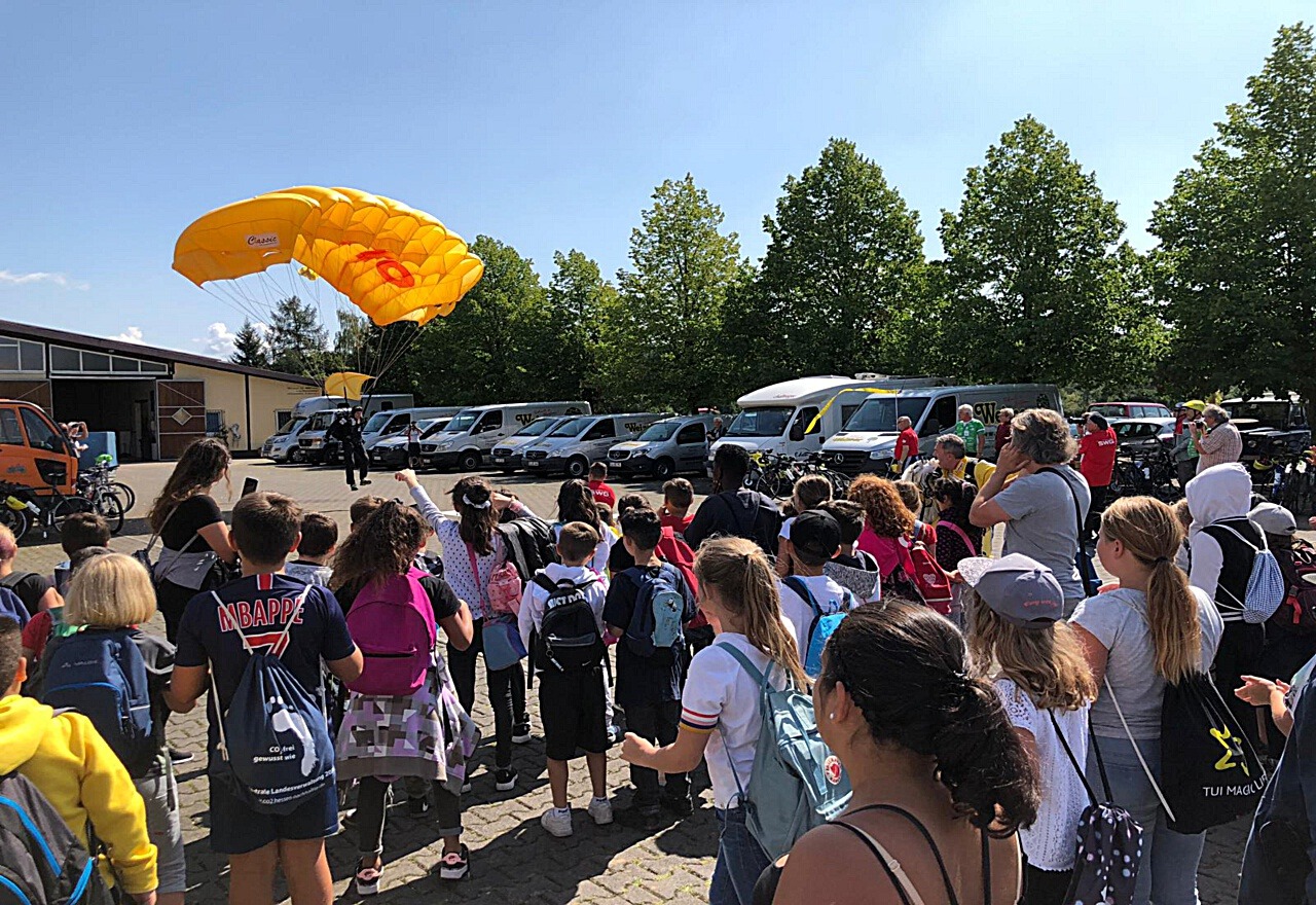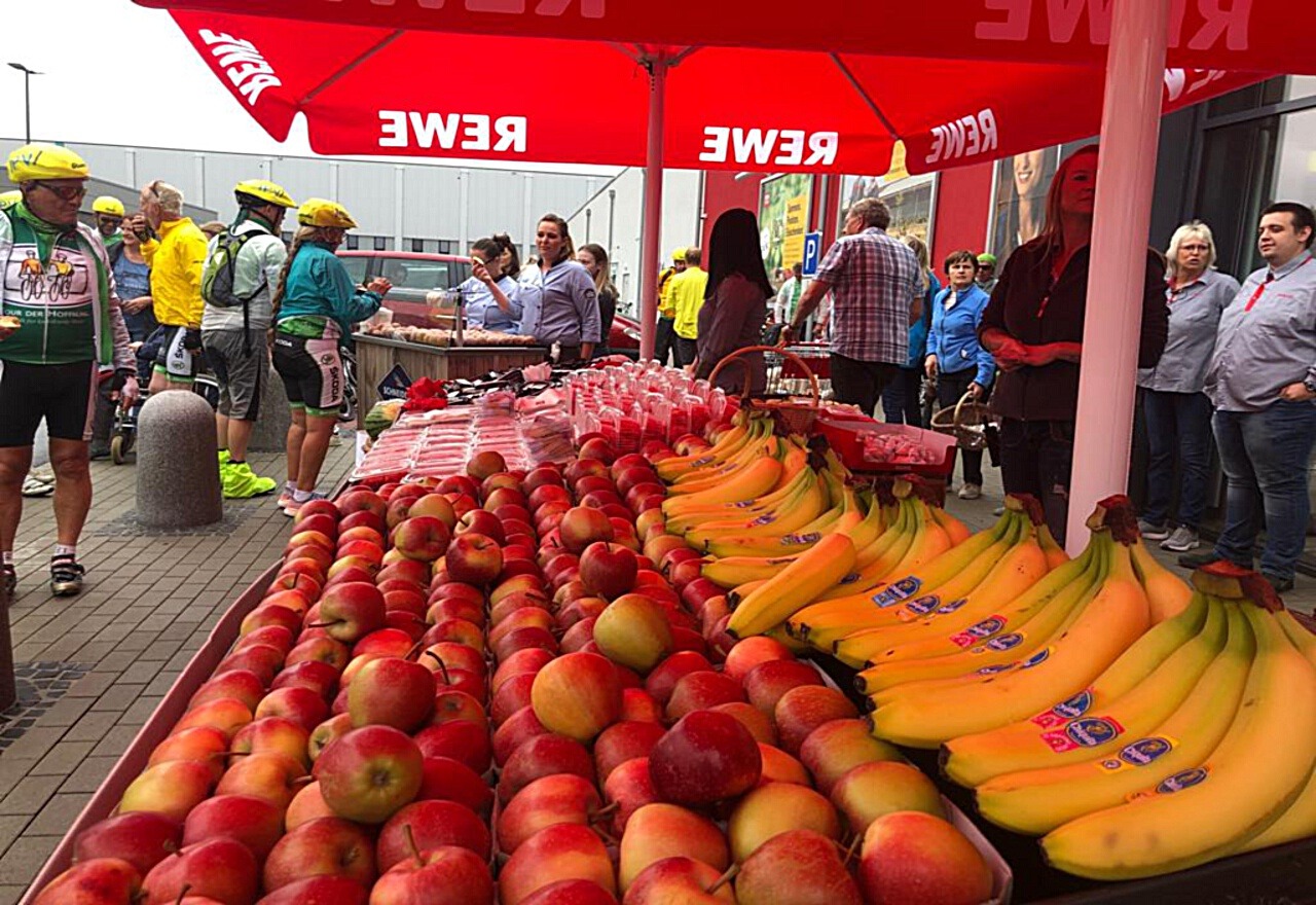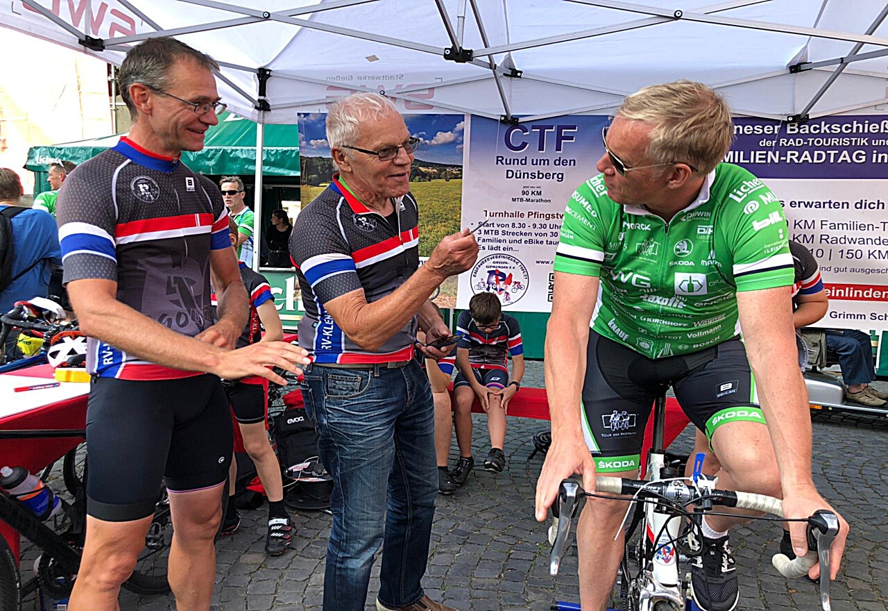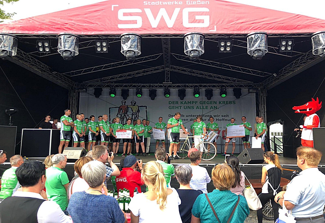 Neben den Spendensummen, den herzlichen Empfängen der Unterstützer und fünf Fallschirm-Sprüngen, die über den Tag verteilt punktgenau auf den Firmengeländen erfolgten, stand die große SWG-Bühne bei einer einstündigen Pause in Gießen im Mittelpunkt. Die Radfahrervereinigung 1904/27 Gießen-Kleinlinden hatte auf dem Kirchenplatz eine Mitmachaktion vorbereitet, die großen Zuspruch fand. Hier schwang sich auch manch prominenter Teilnehmer in der Mittagspause noch einmal extra in den Sattel, um ein Duell auf dem Rollenergometer zu bestreiten. Eine gelunge Ergänzung zum sportlich-informativen Bühnenprogramm.