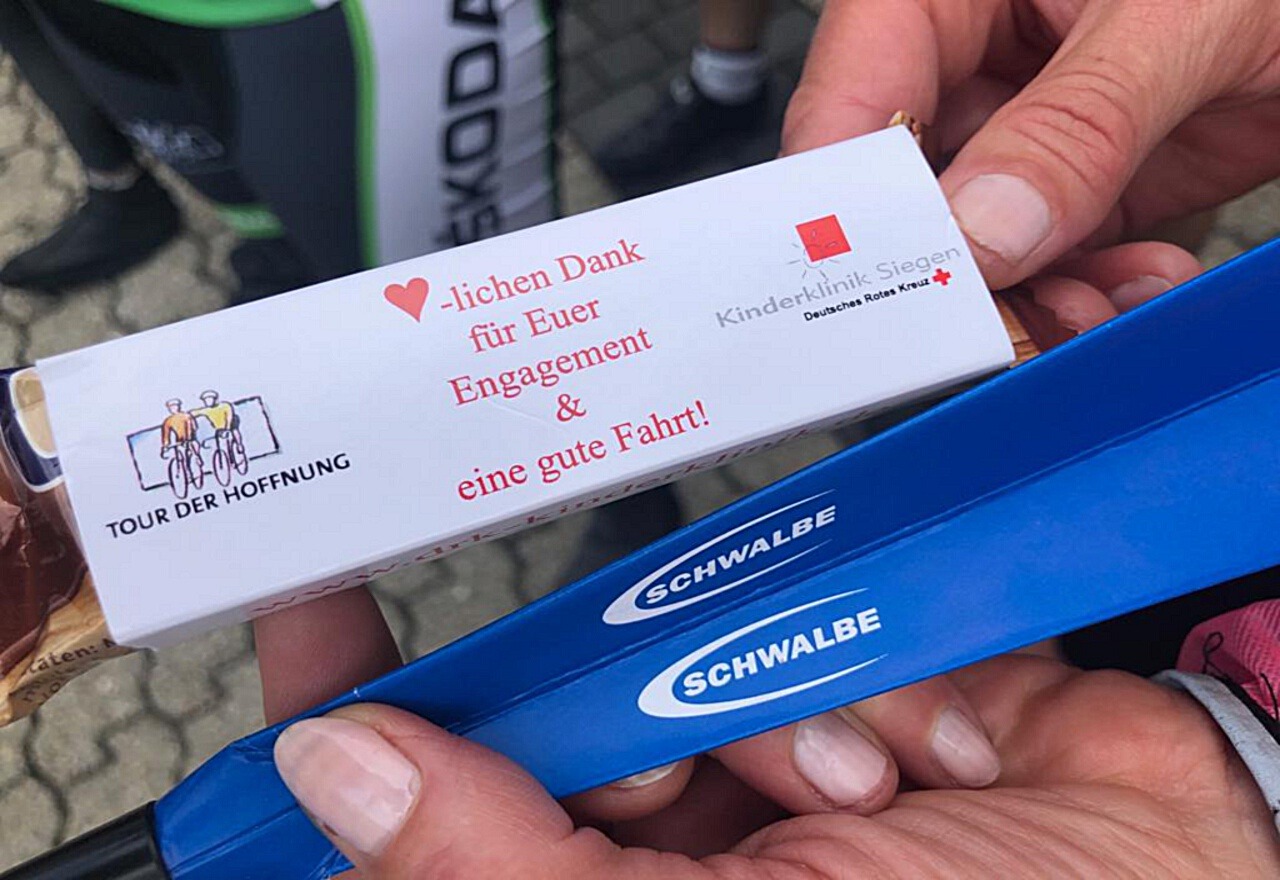 Um 10 Uhr wurde auf dem Gelände der Stadtwerke Gießen (SWG) die Fahrt aufgenommen. Insgesamt elf Stopps waren vorgesehen, bei denen im Vorfeld angekündigte Spenden von Firmen an die Tour der Hoffnung überreicht wurden. Auch durch den Gießener Ortsteil Rödgen, den Stammsitz der Radsportnachrichten.com-Redaktion, schlängelte sich das Fahrerfeld. Gemütliches Rollen war hier aber nicht möglich: Um aus der Wieseckaue durch Rödgen hindurch zum nächsten Spender zu kommen, mussten die Radler kräftig in die Pedale treten. Neben dem guten Zweck, der Unterstützung hilfsbedrüftiger Kinder, motivierte auch die Anfeuerung von Radsportnachrichten.com am Ortsausgang für eine flotte Fahrt, wie unser Video zeigt.
