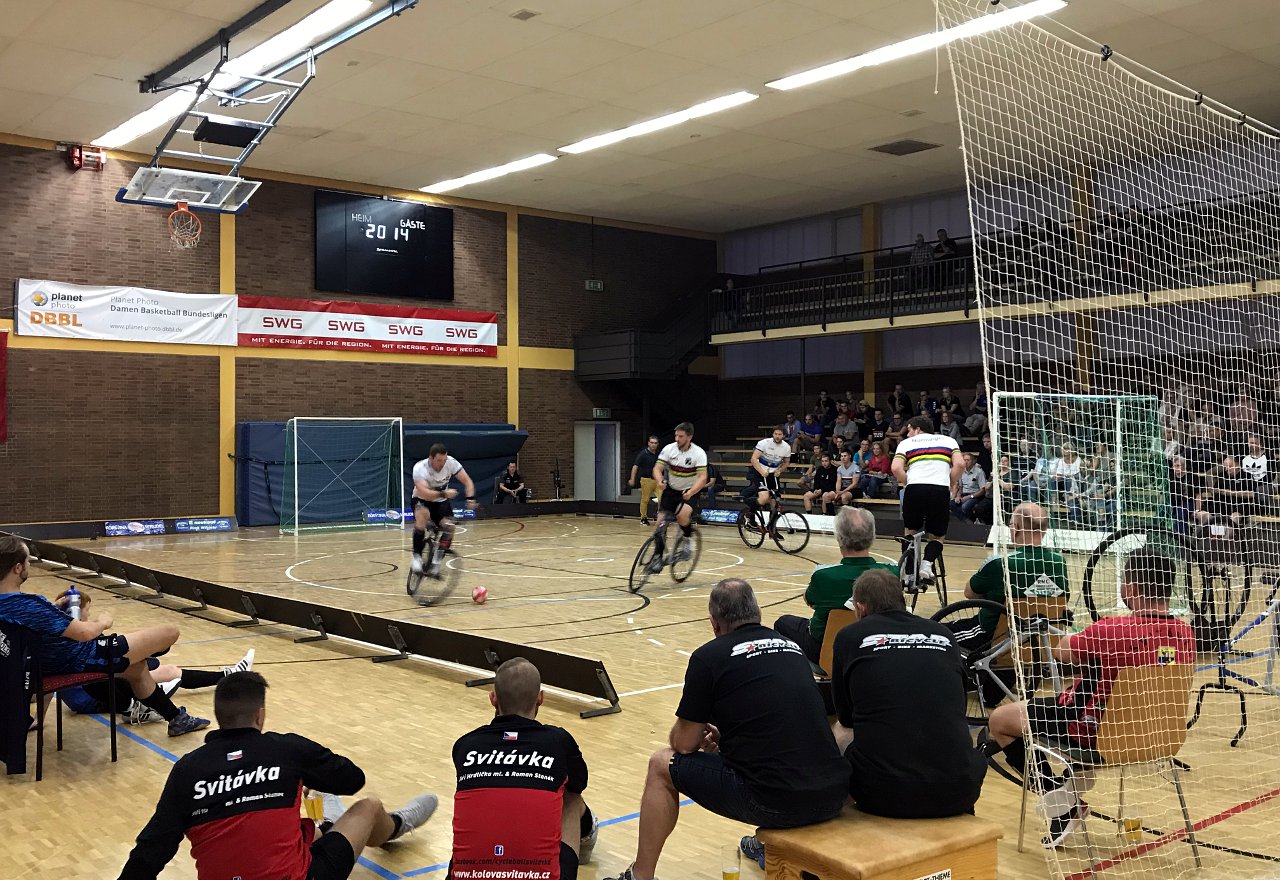 Der amtierende Weltmeister aus Stein bei Nürnberg spielte gegen den fünffachen Weltmeister aus Höchst/Österreich um den Sieg des Turniers. Die Zuschauer in der Krofdorfer Eduard-David-Sporthalle befeuerten das Spitzenduell der internationalen Radball-Bühne stimmungsvoll und sahen letztlich die Österreicher und Weltcup-Gesamtführenden als Sieger in Mittelhessen. (sd | Foto: Stephan Dietel)