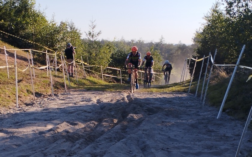 Kehre zwischen zwei Anstiegen: Die Radcross-Elite hatte an den Eingängen der Bunker einige Richtungswechsel zu fahren. Foto: Dieter Deckenbach