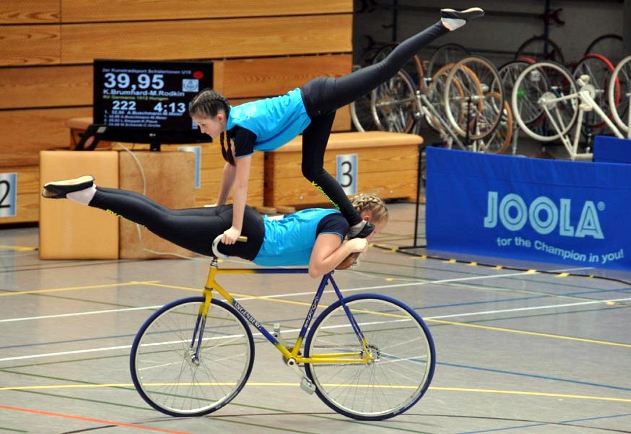 Die Starter im 2er Kunstradsport Schülerinnen zeigten Nervenstärke und fuhren sehr konzentriert eine fehlerfreie Kür. Lediglich für die Ausführung selbst gab es geringe Abwertung. So kam das Team aus Katharina Brumhard und Melina Rodkin (Schülerinnen U15) auf Platz eins und sicherte sich den Hessenmeistertitel mit einer neuen persönlichen Bestleistung von 39,30 Punkten. Platz zwei und damit der Titel des Vize-Hessenmeister ging mit 29,80 Punkten an Lea Viktoria Rodkin und Victoria Eck im 2er Kunstradsport Schülerinnen U13. Auch im 1er Kunstradsport Schülerinnen U11 zeigte Lea Vicktoria Rodkin eine super Kür und erzielte mit 50,91 Punkten eine neue persönliche Bestleistung und holte sich damit den Vize-Hessenmeistertitel.