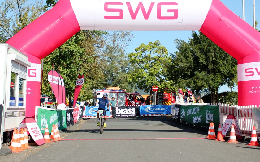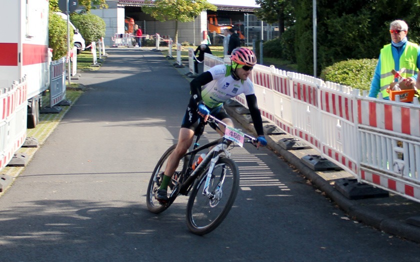 Da ist er: Mika Schöpplein von der SKG Bauschheim / Tri Shop Saar MTB Team hat nach 01:07 Stunde den Sieg des Minimarathon in der Tasche und Erik Büchele nur wenige Meter Rückstand. Foto: Stephan Dietel