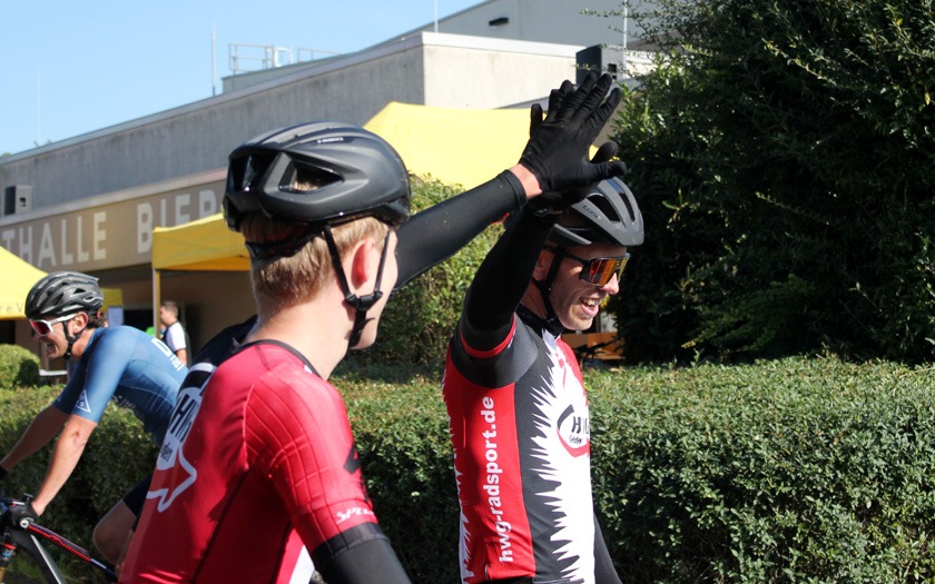 Faire Geste nach hartem Rennen: Vorjahressieger Sascha Starker von der SSG Bensheim im Trikot des Stenger-Bike-Team wird Vierter und gratuliert dem Drittplatzierten Noah Jung. Foto: Stephan Dietel