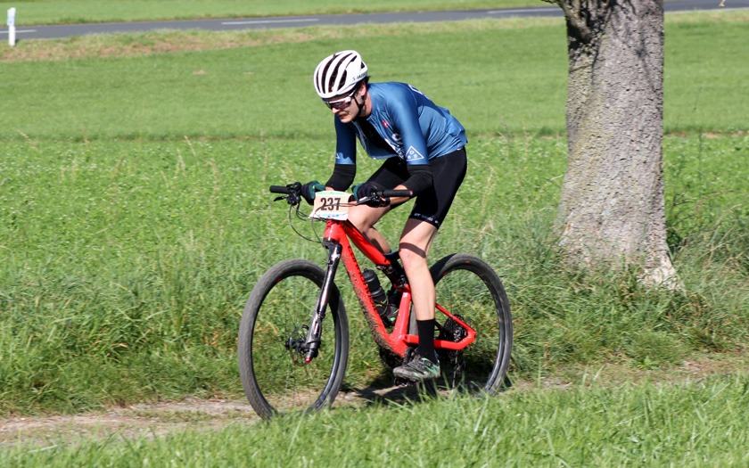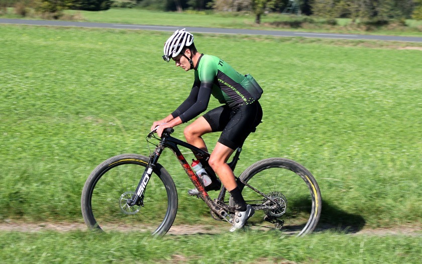 Gut unterwegs, nachdem ihn zwei Jahre in Folge ein Reifenschaden beim Dünsberg-Bike-Marathon stoppte: Kleinlindens Juniorenfahrer Leonhard Schneider. Foto: Stephan Dietel